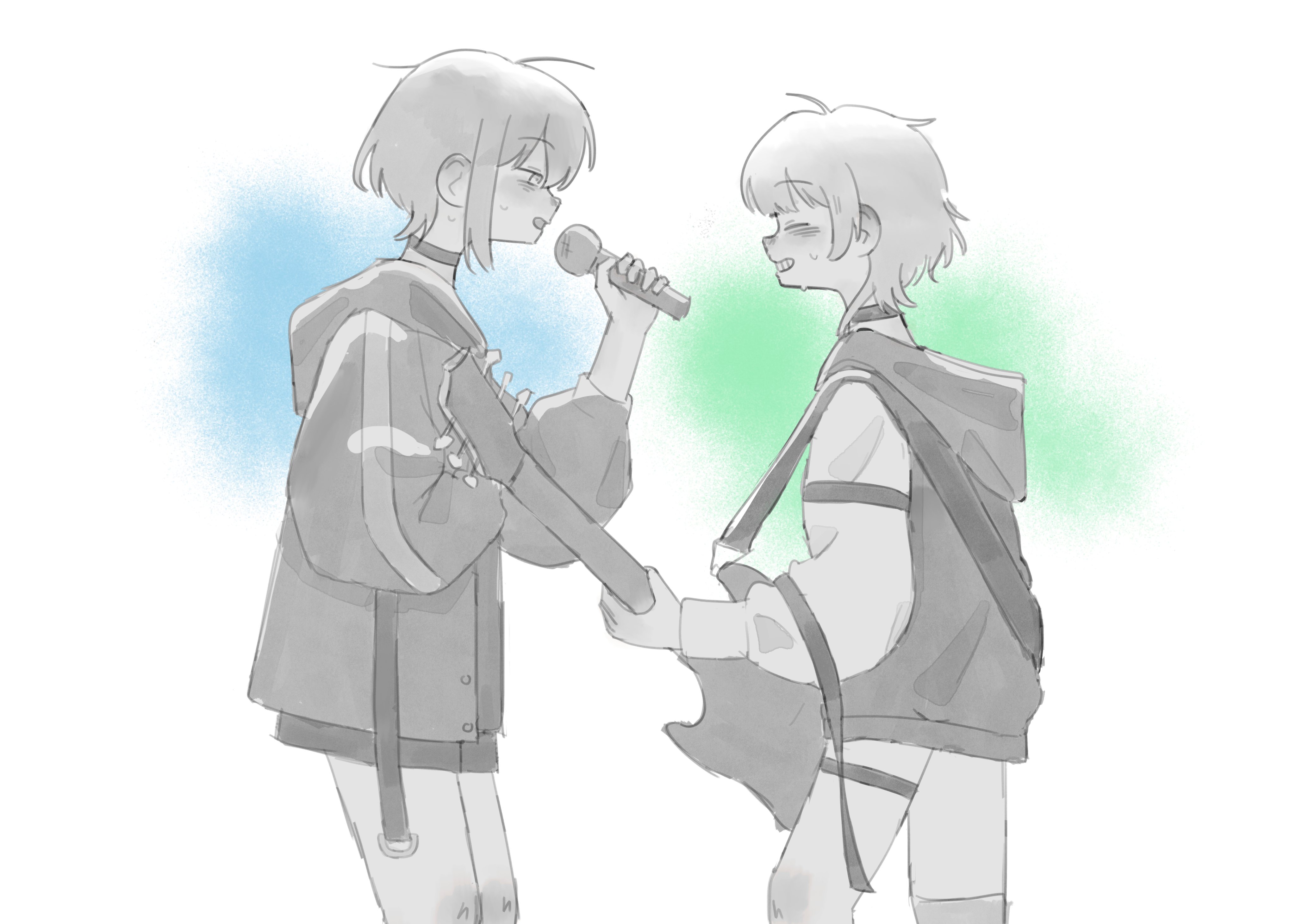 2girls absurdres bang_dream! bang_dream!_it's_mygo!!!!! blue_background blush choker commentary electric_guitar from_side gampong44 green_background greyscale_with_colored_background grin guitar highres holding holding_guitar holding_instrument holding_microphone hood hoodie instrument kaname_raana long_sleeves looking_at_another microphone multiple_girls music open_mouth playing_guitar playing_instrument profile short_hair singing skirt smile sweat takamatsu_tomori thigh_strap white_background