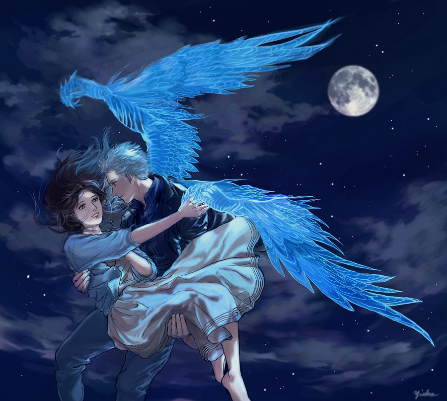 1boy 1girl blue_jacket brown_eyes brown_hair carrying carrying_person devil_may_cry devil_may_cry_(series) devil_may_cry_4 devil_may_cry_5 full_moon jacket jewelry kyrie_(devil_may_cry) moon necklace nero_(devil_may_cry) night niko_(silent.whitesnow) short_hair sky smile star_(sky) white_hair wings