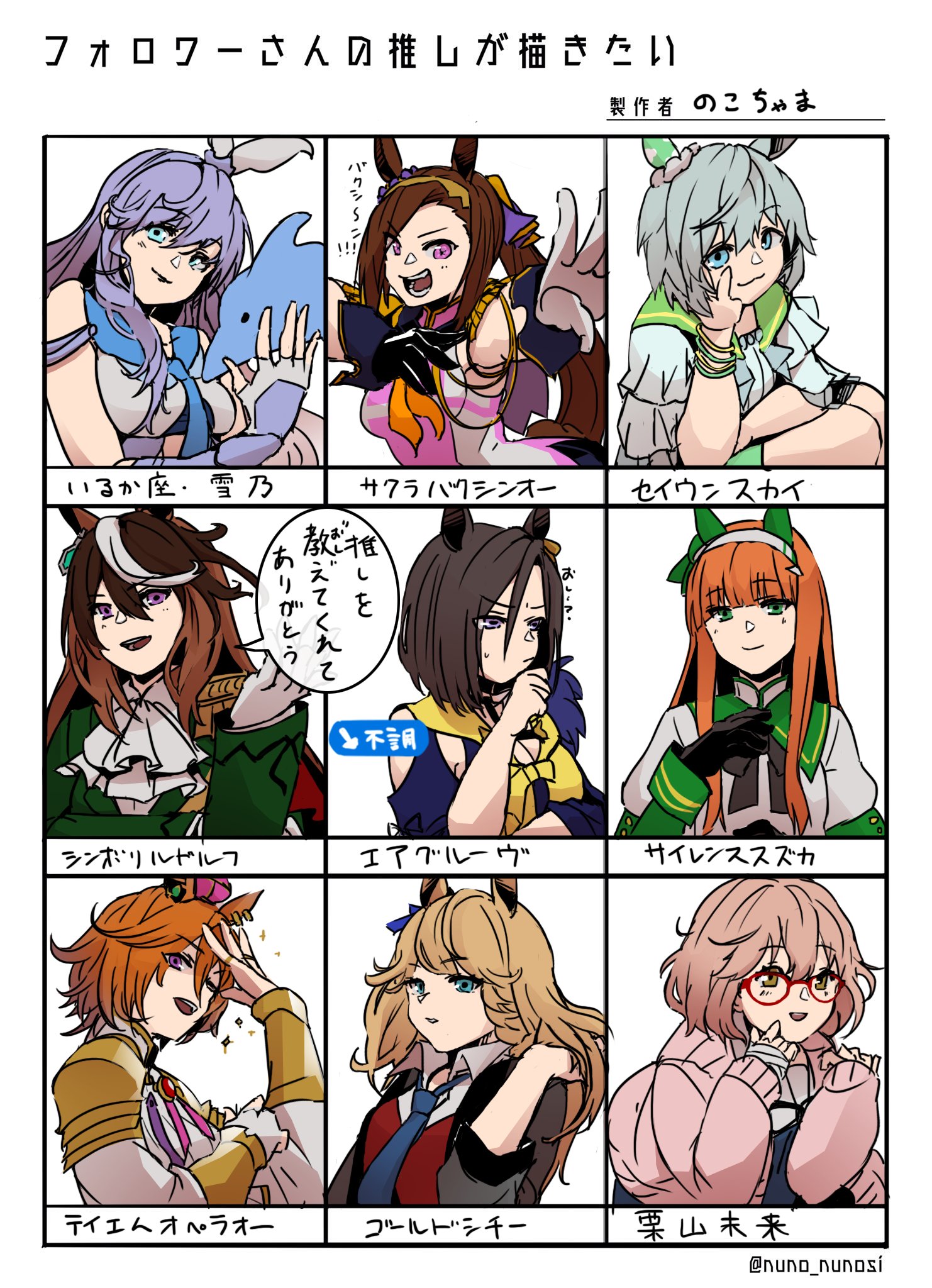 6+girls air_groove_(empress_road)_(umamusume) air_groove_(umamusume) ascot blonde_hair breasts brown_hair character_name delphinus_yukino_(saint_seiya:_rising_cosmo) fingerless_gloves followers_favorite_challenge glasses gloves gold_city_(umamusume) highres kuriyama_mirai kyoukai_no_kanata multiple_drawing_challenge multiple_girls noko-chan open_mouth orange_hair purple_hair sailor_collar saint_seiya saint_seiya:_rising_cosmo sakura_bakushin_o_(blossom_in_learning)_(umamusume) sakura_bakushin_o_(umamusume) seiun_sky_(reeling_in_the_big_one)_(umamusume) seiun_sky_(umamusume) short_hair silence_suzuka_(innocent_silence)_(umamusume) silence_suzuka_(umamusume) smile symboli_rudolf_(emperor's_path)_(umamusume) symboli_rudolf_(umamusume) t.m._opera_o_(o_sole_suo!)_(umamusume) t.m._opera_o_(umamusume) umamusume