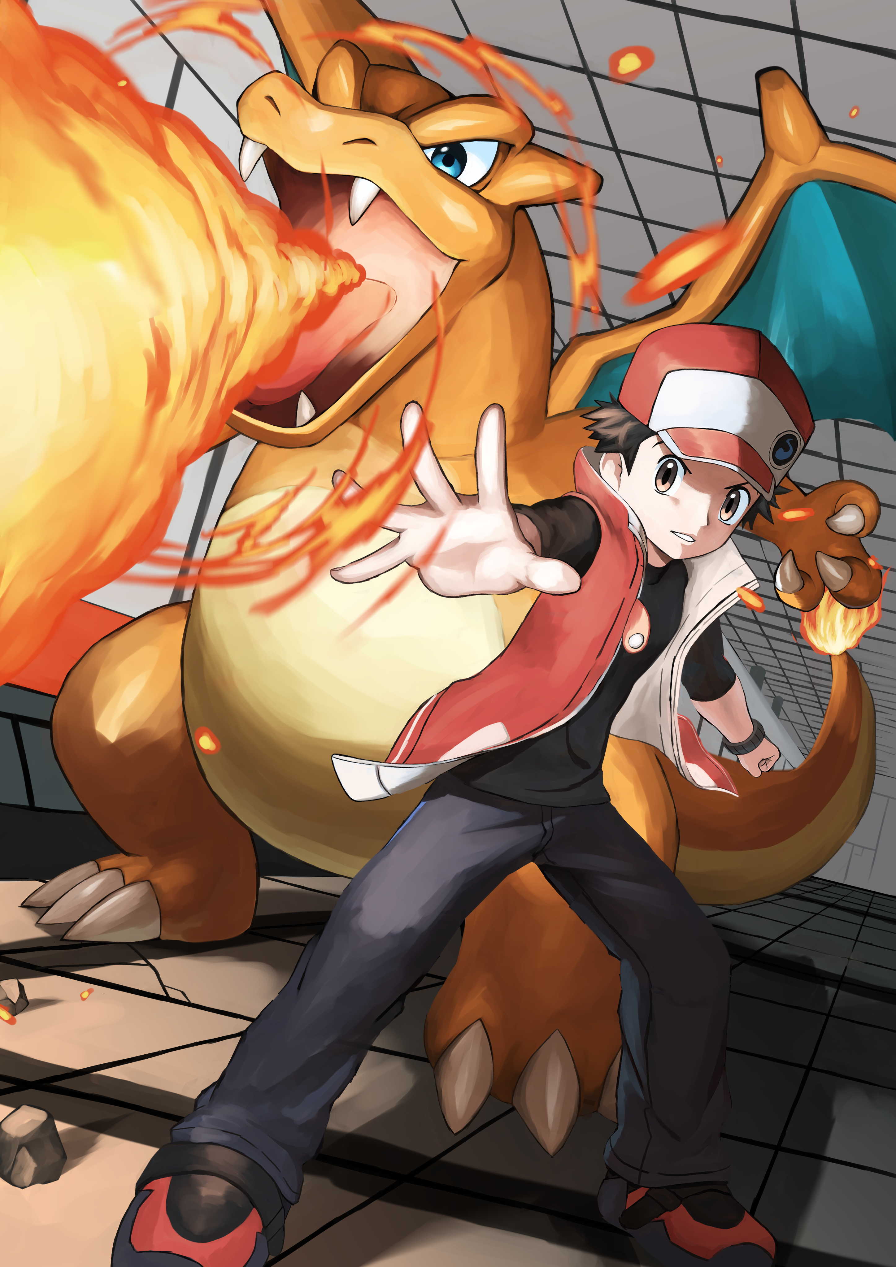 1boy absurdres black_shirt breath_weapon breathing_fire brown_eyes brown_hair ceiling charizard claws clenched_hand commentary_request fire gen_1_pokemon hat highres indoors jira_(ziraiya26) male_focus nintendo official_alternate_costume open_clothes open_vest outstretched_arms pants pokemon pokemon_(creature) pokemon_masters_ex red_(pokemon) red_(sygna_suit)_(pokemon) red_hat red_vest shirt shoes short_hair spread_fingers squatting standing teeth vest