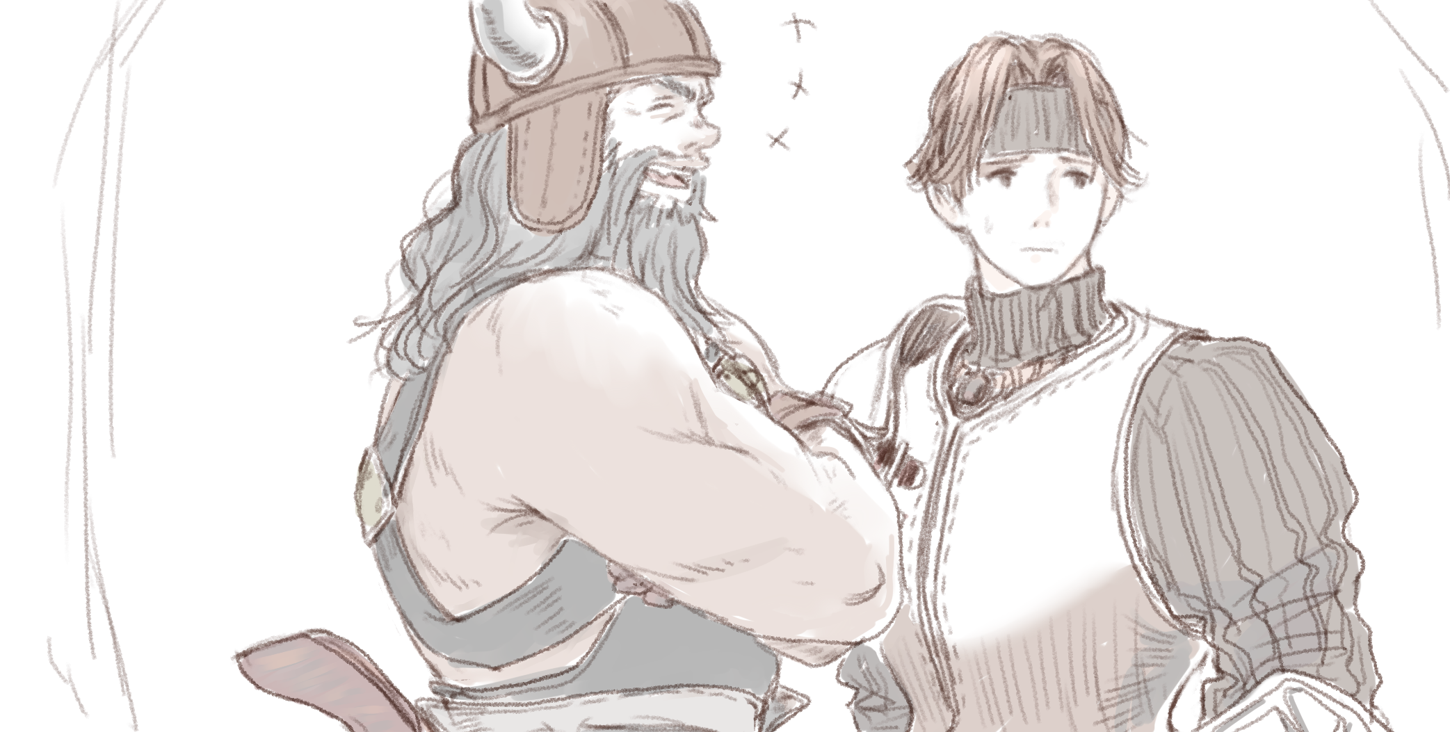 2boys armor beard black_hair brown_hair closed_eyes crossed_arms denim_powell facial_hair fake_horns headband helmet highres horned_helmet horns long_sleeves male_focus multiple_boys muscular muscular_male open_mouth simple_background tactics_ogre white_background windcaller xapan_illudas