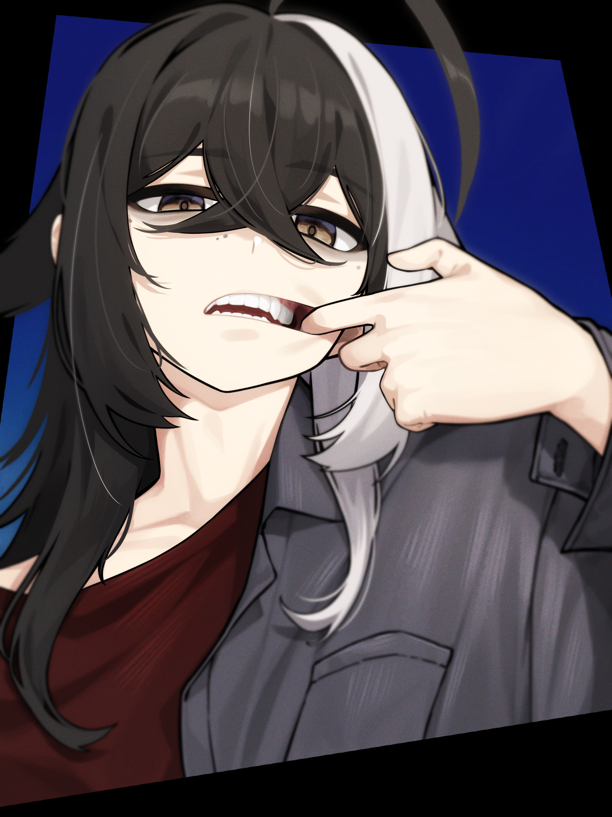 1girl ahoge black_background black_hair blue_background brown_hair collarbone commentary_request dev_(dev0614) grey_jacket highres jacket long_sleeves looking_at_viewer mouth_pull multicolored_hair open_clothes open_jacket original red_shirt shirt solo teeth two-tone_background two-tone_hair upper_body white_hair
