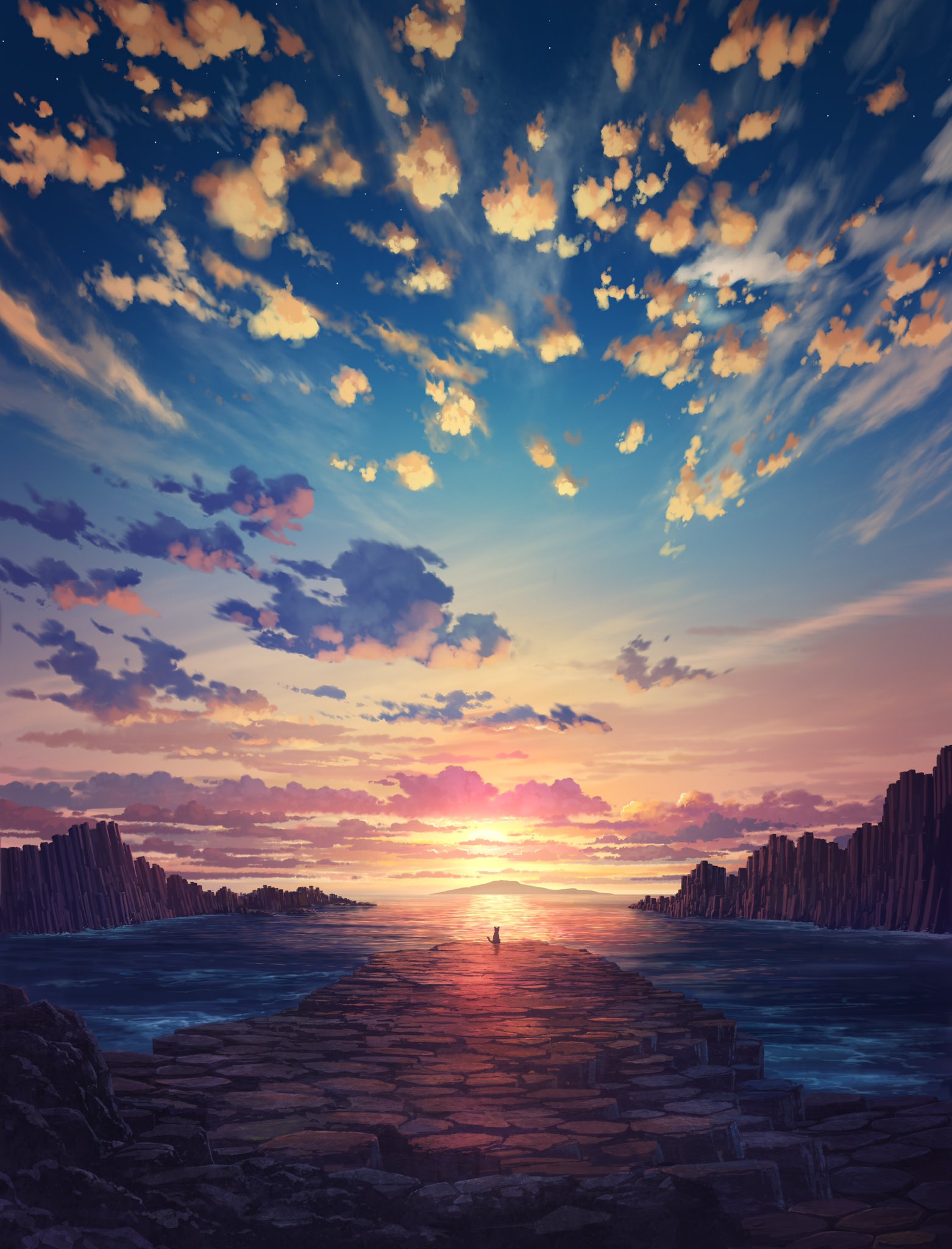 blue_sky cat cliff cloud cloudy_sky columnar_jointing commentary gradient_sky highres no_humans ocean orange_sky original outdoors pei_(sumurai) scenery sky sunlight sunset water