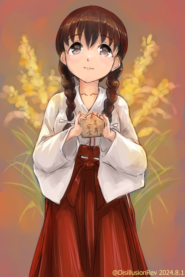 1girl alternate_costume braid brown_hair dated ema hakama japanese_clothes kamio_(d-rev) kantai_collection kimono landing_ship_no._101_(kancolle) low_twintails miko one-hour_drawing_challenge red_hakama smile solo twin_braids twintails twitter_username wheat white_kimono