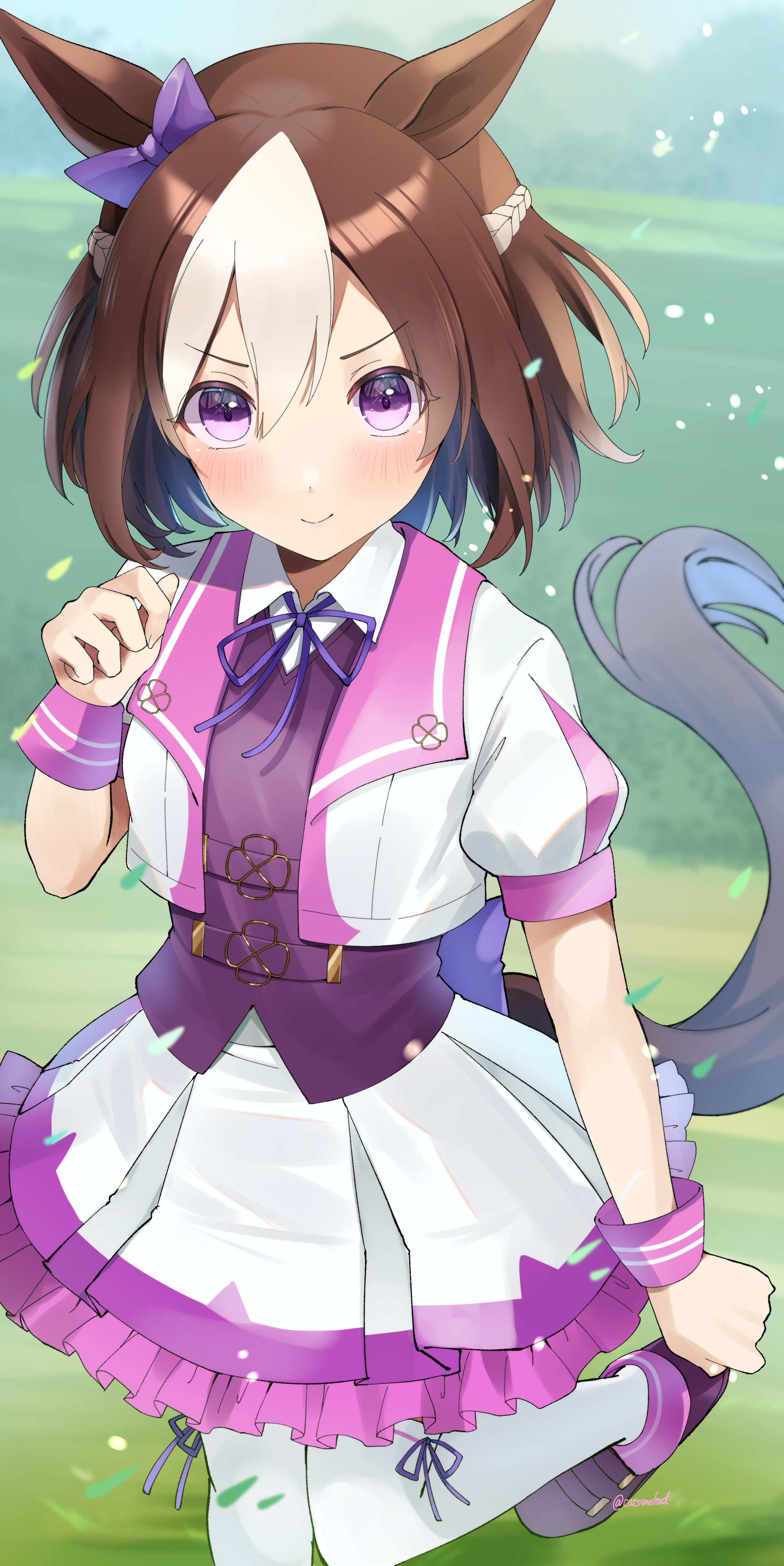 1girl absurdres animal_ears blurry blurry_background blush breasts brown_hair commentary_request grass hair_between_eyes hair_ornament highres horse_ears horse_girl horse_tail looking_at_viewer medium_breasts purple_eyes smile solo special_week_(special_dreamer)_(umamusume) special_week_(umamusume) tail thighhighs toketa_neko umamusume