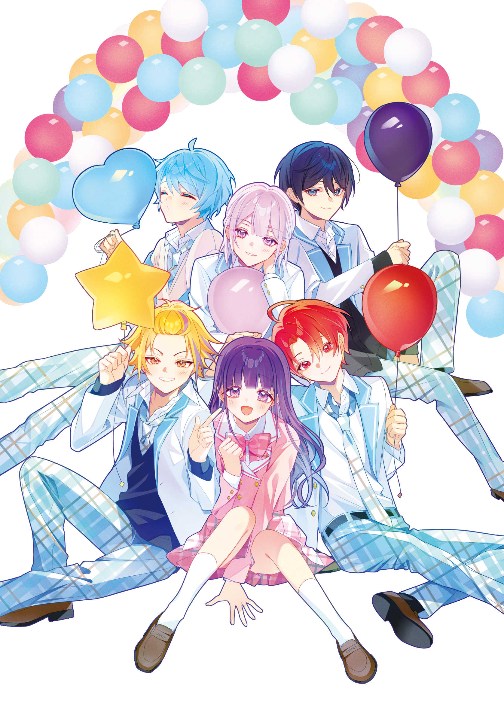 1girl 5boys :d balloon bangs_pinned_back between_legs black_hair black_socks black_sweater blazer blonde_hair blue_hair blue_necktie blush bow brown_footwear brown_sweater chano_hinano closed_eyes closed_mouth collared_shirt commentary_request dress_shirt forehead grin hand_between_legs head_tilt heart_balloon highres hiyori_sora holding holding_balloon hyouka_yuki inazuma_rai jacket knees_up loafers long_sleeves multiple_boys necktie official_art open_clothes open_jacket open_mouth orange_eyes pants pink_bow pink_hair pink_jacket plaid_clothes plaid_pants purple_eyes purple_hair red_eyes red_hair school_uniform shirt shizukugawa_ame shoe_soles shoes simple_background sitting smile socks star_(symbol) star_balloon sweater tenyou_hare utaite! white_background white_jacket white_necktie white_shirt white_socks yagiri_kumo