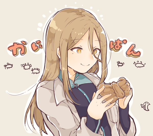 1boy animal bodysuit bright_pupils brown_hair diving_suit hair_between_eyes holding holding_animal idolmaster idolmaster_side-m koron_chris lab_coat light_brown_background looking_at_animal male_focus nk_nemumi portrait simple_background smile solo wetsuit white_pupils yellow_eyes