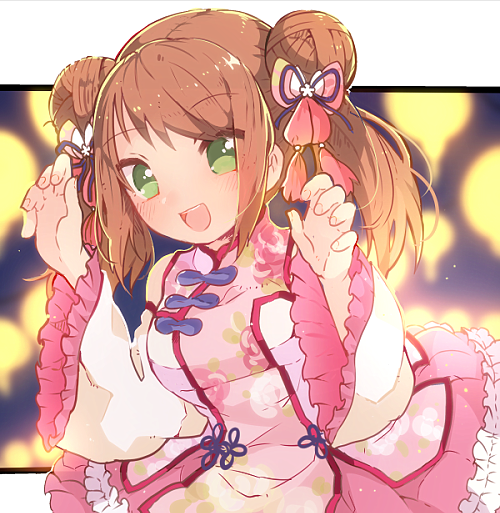1boy :d blush brown_hair chinese_clothes claw_pose double_bun dress frilled_sleeves frills green_eyes hair_bun idolmaster idolmaster_side-m letterboxed long_sleeves looking_at_viewer male_focus mizushima_saki nk_nemumi open_mouth outside_border pink_dress short_twintails smile solo trap twintails wide_sleeves