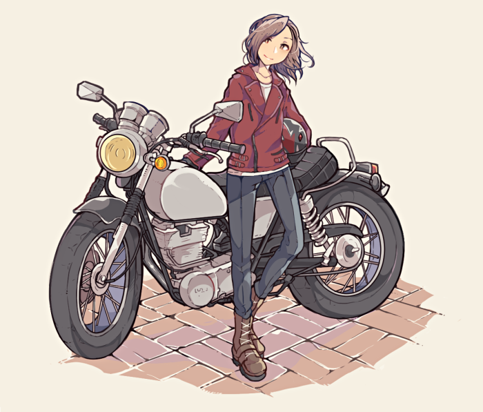 1boy boots bright_pupils brown_boots brown_eyes brown_hair denim full_body hair_down helmet holding holding_unworn_helmet idolmaster idolmaster_side-m jacket jeans long_hair male_focus motor_vehicle motorcycle motorcycle_helmet nk_nemumi official_alternate_costume official_alternate_hairstyle pants red_jacket shirt simple_background smile solo unworn_helmet watanabe_minori white_background white_pupils white_shirt