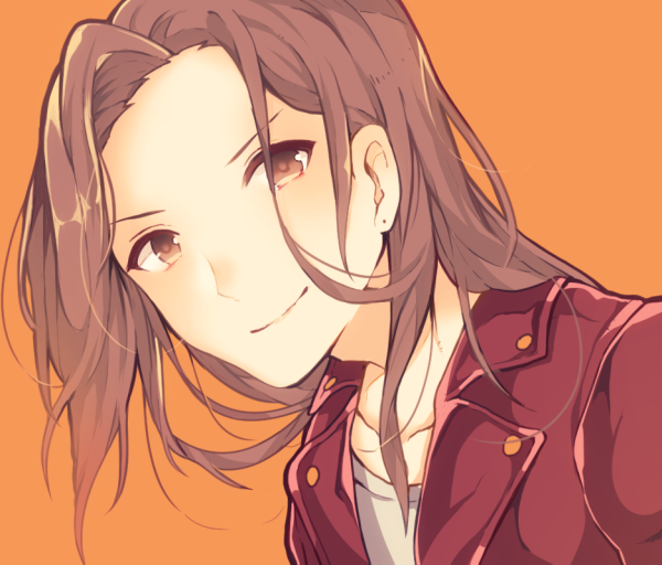 1boy brown_eyes brown_hair hair_down idolmaster idolmaster_side-m jacket long_hair looking_at_viewer loose_hair_strand male_focus nk_nemumi official_alternate_costume official_alternate_hairstyle orange_background portrait red_jacket shirt simple_background smile solo watanabe_minori white_shirt