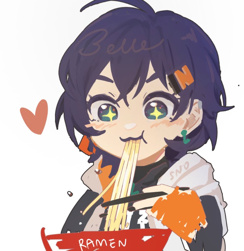 +_+ 1girl belle_(zenless_zone_zero) blue_hair blush bowl chopsticks commentary earrings eating english_commentary english_text food gloves green_eyes hair_ornament heart holding holding_chopsticks jacket jewelry noodles orange_gloves short_hair simple_background smile snorezu solo upper_body white_background zenless_zone_zero