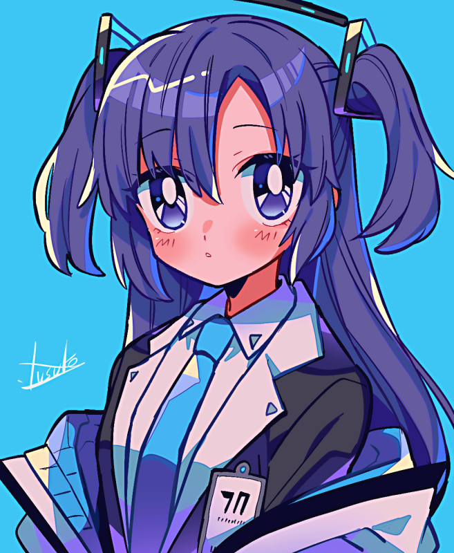 1girl black_jacket blazer blue_archive blue_background blue_necktie blush collared_shirt from_side hair_between_eyes hair_ornament hashtag-only_commentary jacket lapels long_hair looking_at_viewer necktie notched_lapels parted_hair parted_lips purple_eyes purple_hair retro_artstyle shirt signature simple_background solo two_side_up upper_body white_shirt yuuka_(blue_archive) yuusuke-kun