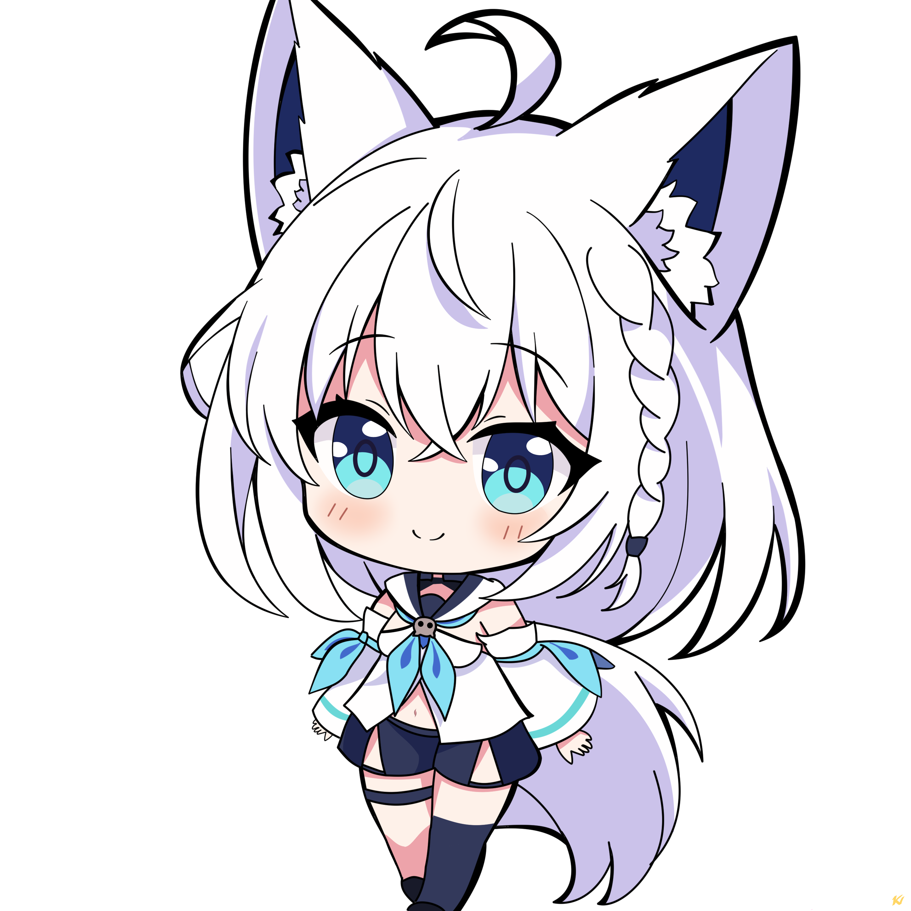 1girl absurdres ahoge animal_ear_fluff animal_ears aqua_eyes blue_neckerchief braid chibi clothing_cutout crossed_bangs detached_sleeves fox_ears fox_girl fox_tail full_body highres hololive kosaka_utaha long_hair navel navel_cutout neckerchief sailor_collar shirakami_fubuki shirakami_fubuki_(1st_costume) simple_background single_braid single_thighhigh smile solo standing tail thigh_strap thighhighs transparent_background virtual_youtuber white_hair