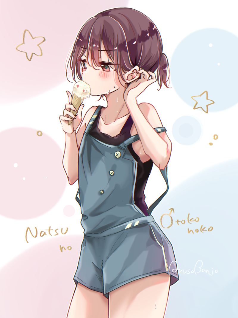1boy armpits banjou_azusa black_hair black_tank_top blush buttons crossdressing crossdressing_(mtf) food hair_between_eyes heart hiura_mihate holding holding_food holding_ice_cream ice_cream ice_cream_cone koisuru_(otome)_no_tsukurikata male_focus mars_symbol pink_eyes short_hair simple_background sleeveless solo star_(symbol) tank_top trap