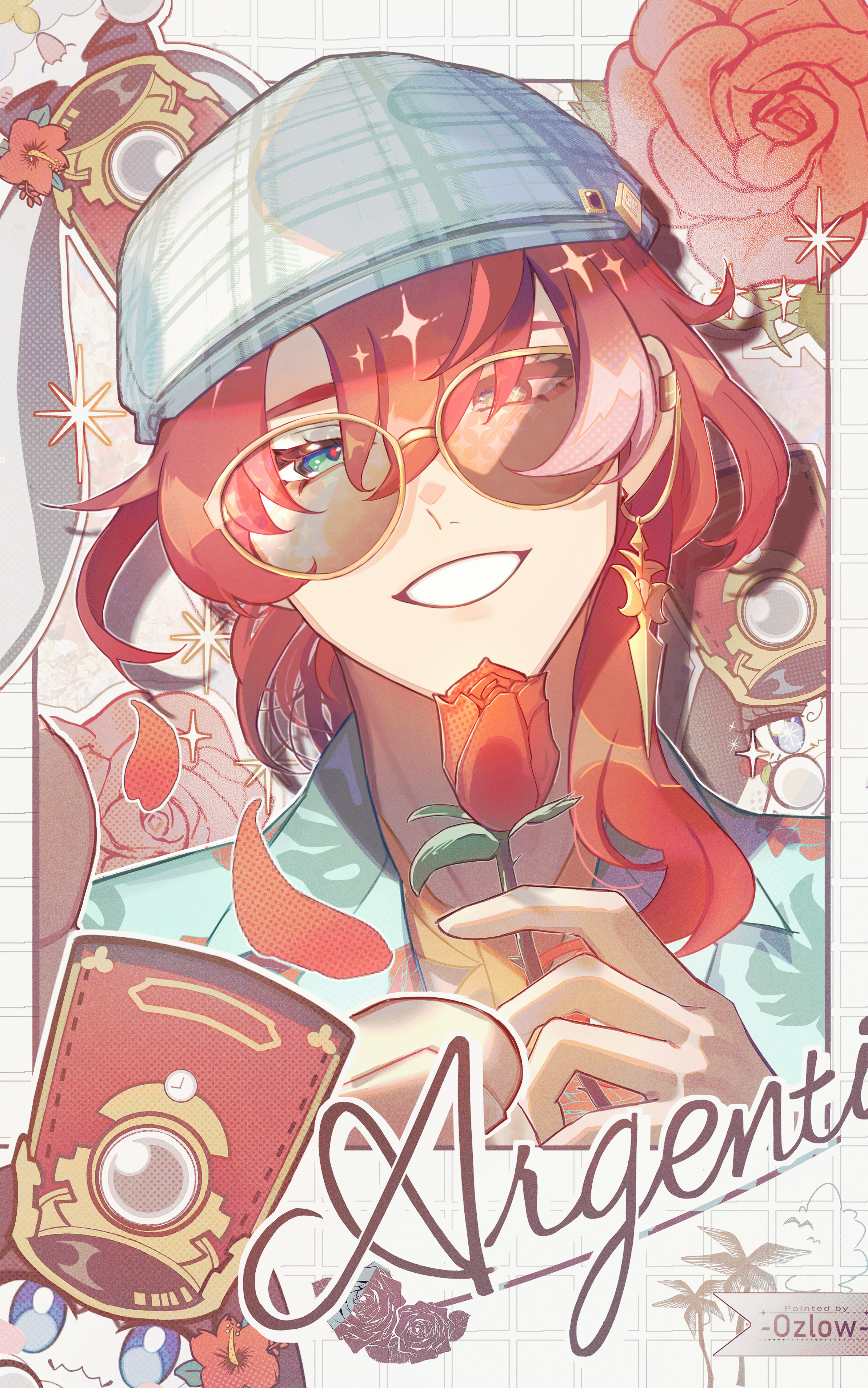 1boy absurdres alternate_costume argenti_(honkai:_star_rail) artist_name character_signature character_sticker collared_shirt commentary_request earrings flower green_eyes hair_between_eyes hat hawaiian_shirt highres holding holding_flower honkai:_star_rail honkai_(series) jewelry long_hair looking_at_viewer male_focus ozuro_(orzbone2008) plaid_clothes plaid_hat pom-pom_(honkai:_star_rail) portrait red_flower red_hair red_pupils red_rose rose shirt sidelocks smile solo sticker teeth