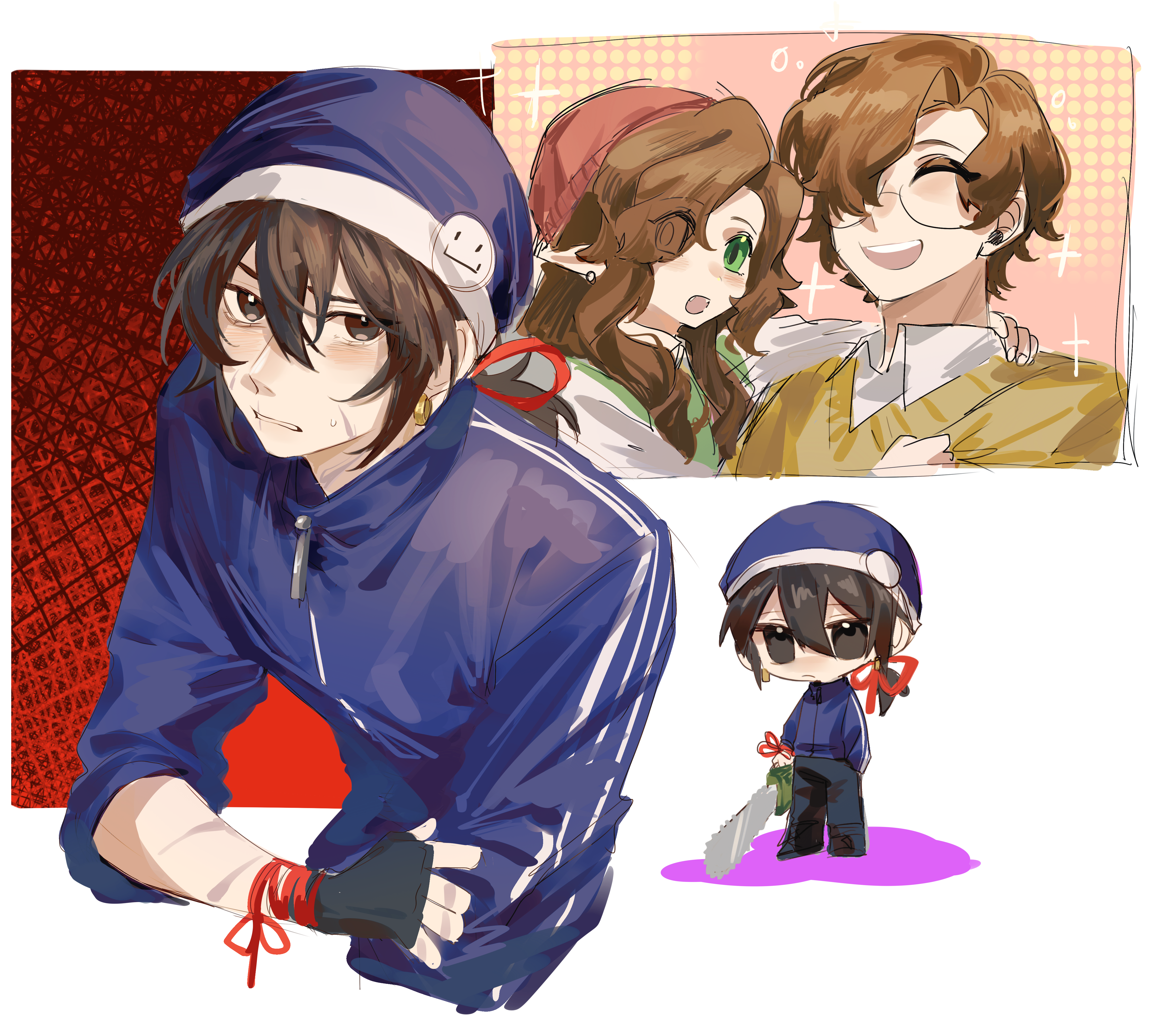1girl 2boys absurdres adoptive_parent_and_adoptive_child alternate_hair_length alternate_hairstyle beanie black_hair blue_hat blue_jacket brown_hair chainsaw chibi chinese_commentary commentary_request father_and_child father_and_daughter hair_ribbon hat highres holding holding_chainsaw jacket long_hair male_focus minecraft_youtube multiple_boys parent_and_child personification pointy_ears ponytail quackity quackity_smp red_hat ribbon sweater tallulah_(old_design)_(quackity_smp) tallulah_(quackity_smp) white_background wilbur_soot wumingshi16034 yellow_sweater zipper