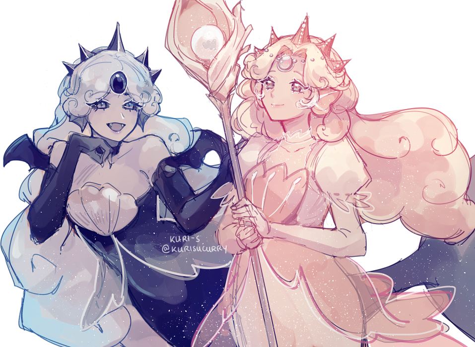 1girl artist_name black_gloves black_pearl_cookie colored_skin cookie_run cookie_run:_kingdom crown curly_hair dress dual_persona elbow_gloves eyelashes fins gloves head_fins jewelry kuri-s light_persona long_hair looking_at_viewer mermaid monster_girl open_mouth pink_eyes pink_hair smile strapless strapless_dress tiara tumblr_username twitter_username wavy_hair white_hair white_pearl_cookie wings