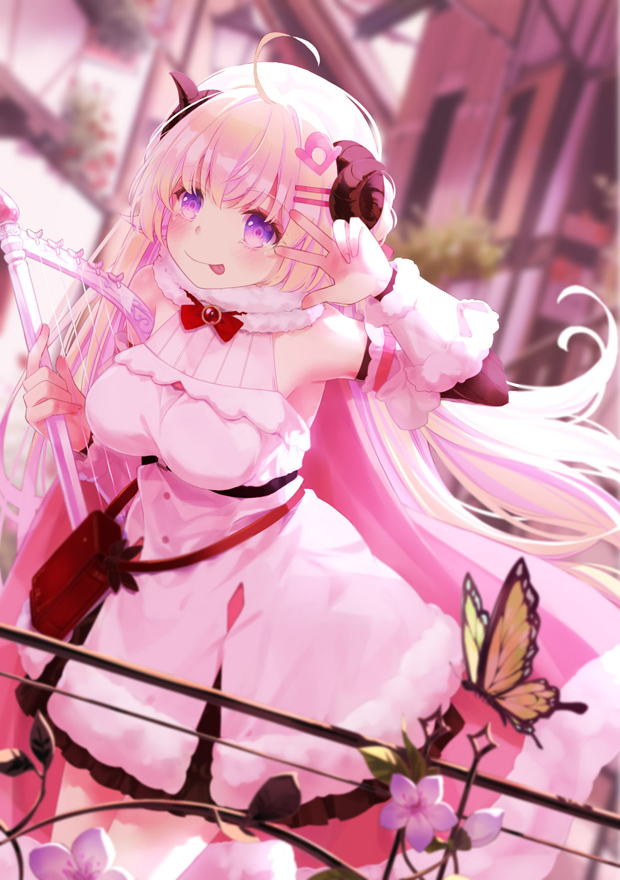 1girl 54hao ahoge animal_ears blonde_hair blush bug butterfly dress fur-trimmed_dress fur_trim hair_ornament hairpin highres hololive horns insect long_hair looking_at_viewer purple_eyes sheep_ears sheep_girl sheep_horns smile solo tongue tongue_out tsunomaki_watame tsunomaki_watame_(1st_costume) virtual_youtuber white_dress