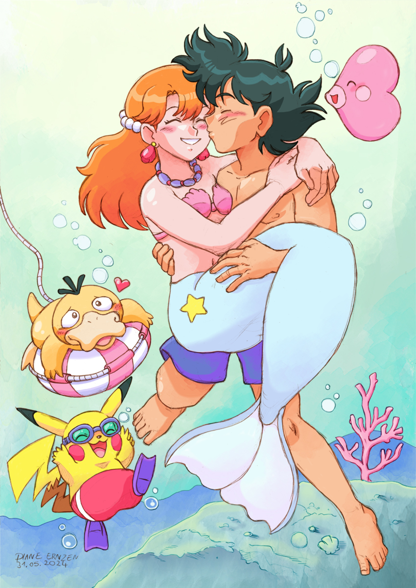 1boy 1girl ash_ketchum black_hair breasts bubble closed_eyes dated diane_ernzen feet fins fish_tail gen_1_pokemon gen_3_pokemon kiss kissing_cheek long_hair luvdisc mermaid mermaid_misty_(pokemon) misty_(pokemon) monster_girl nintendo orange_hair pikachu pokemon pokemon_(anime) pokemon_(classic_anime) psyduck smile swimming tail underwater