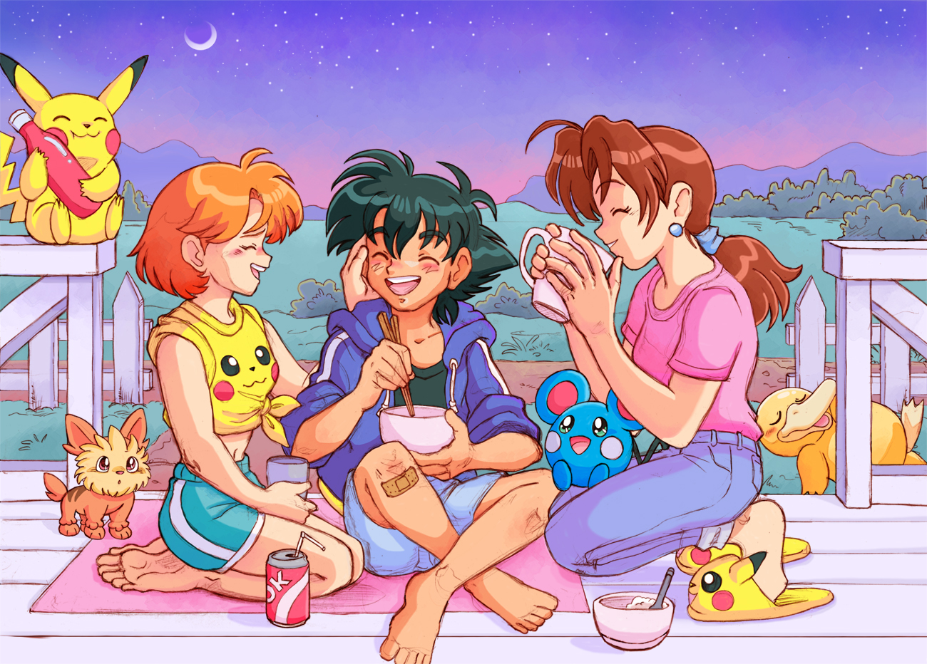 1boy 2girls ash_ketchum azurill barefoot black_hair bowl chopsticks closed_eyes cup delia_ketchum diane_ernzen earrings feet food gen_1_pokemon gen_3_pokemon gen_5_pokemon jewelry ketchup ketchup_bottle lillipup misty_(pokemon) moon mug multiple_girls night nintendo open_mouth orange_hair pikachu pokemon pokemon_(anime) pokemon_(classic_anime) ponytail psyduck sitting sleeping slippers smile