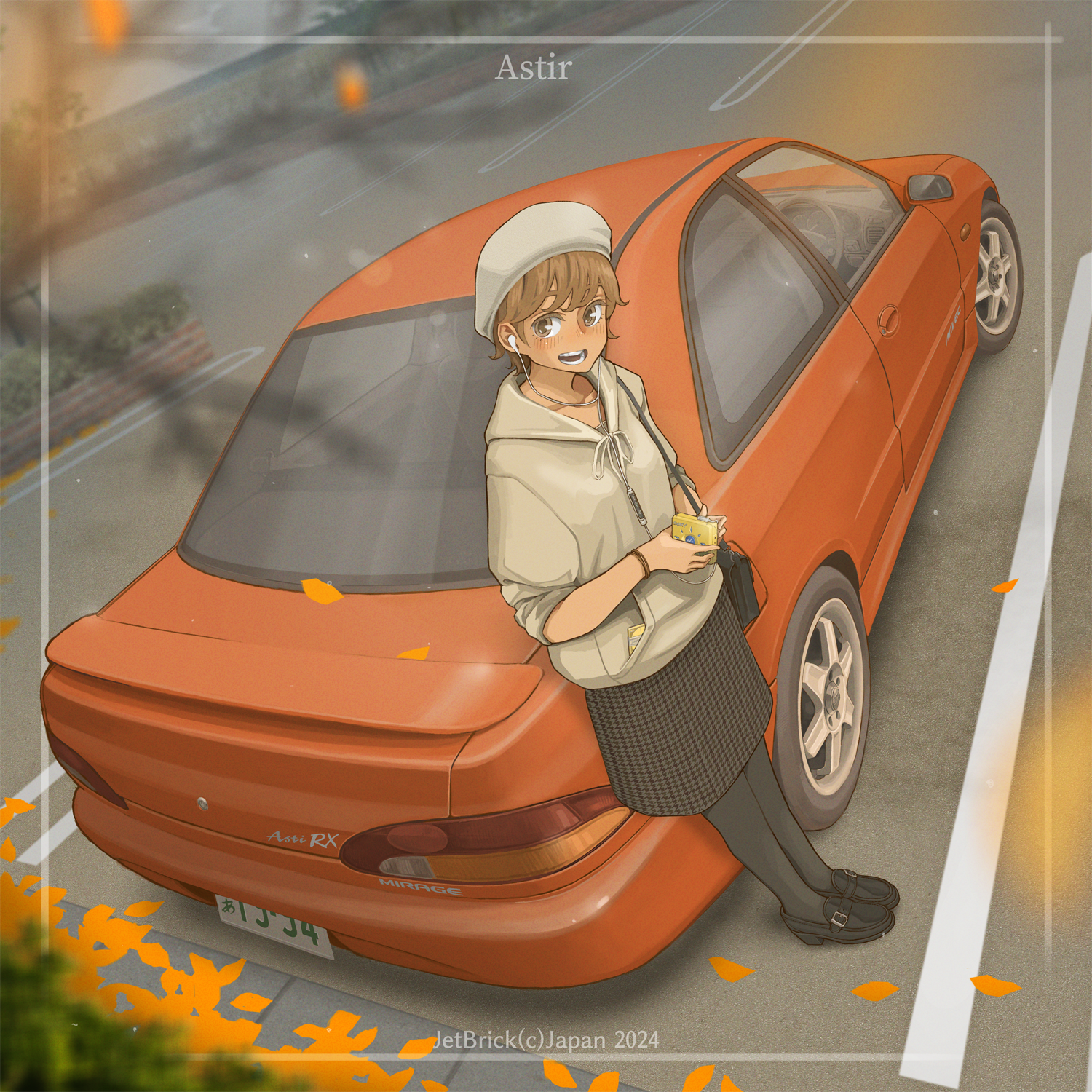 1girl :d bag beret black_footwear black_pantyhose black_skirt brown_eyes brown_hair car earphones handbag hat highres jacket jettoburikku license_plate mitsubishi_mirage mitsubishi_mirage_asti mitsubishi_motors motor_vehicle open_mouth original pantyhose parking_lot plaid_clothes plaid_skirt sailor_jacket short_hair skirt sleeves_rolled_up smile solo spoiler_(automobile) teeth vehicle_focus vehicle_request white_hat white_jacket