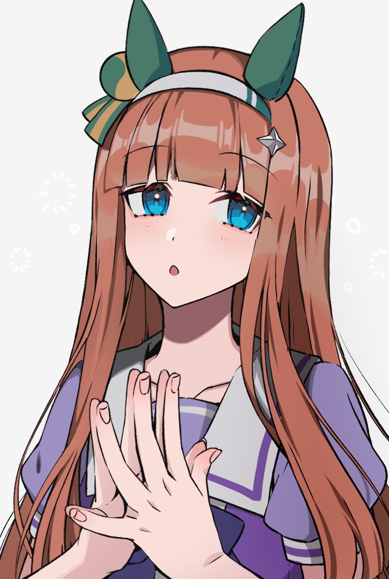 1girl animal_ears blue_eyes bow bowtie ear_covers hair_ornament hairband horse_ears horse_girl jacket long_hair looking_at_viewer open_mouth own_hands_together puffy_short_sleeves puffy_sleeves purple_bow purple_bowtie purple_jacket red_hair school_uniform short_sleeves silence_suzuka_(umamusume) simple_background solo star_(symbol) star_hair_ornament tracen_school_uniform umamusume upper_body white_background white_hairband yuura