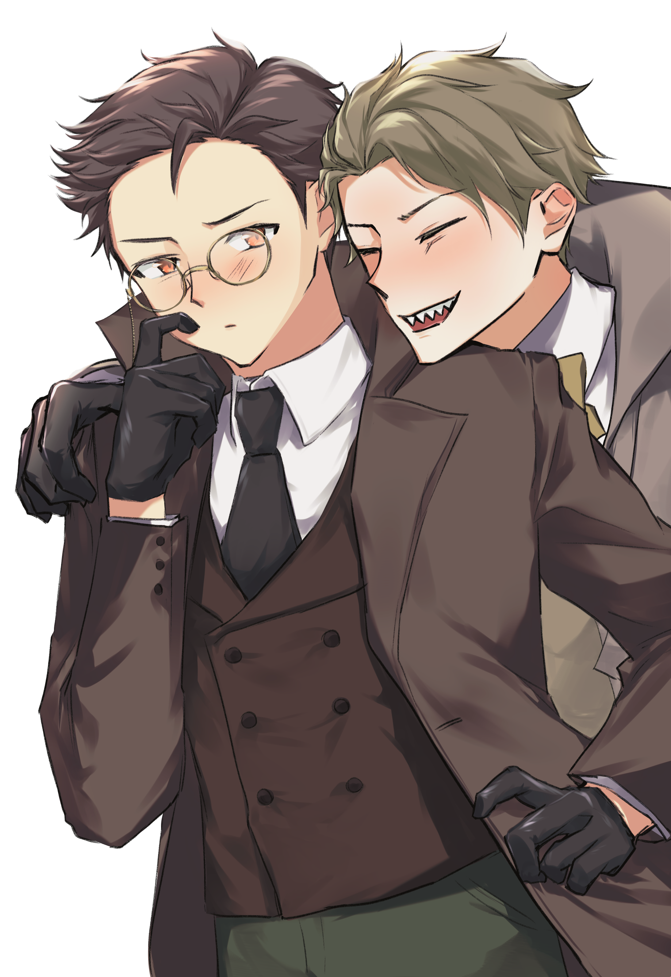 2boys absurdres akuno_hideo black_gloves black_hair black_jacket black_necktie black_vest blush brown_eyes brown_hair brown_necktie character_request closed_eyes glasses gloves hand_up highres idolmaster idolmaster_side-m jacket kas_x6 multiple_boys necktie sharp_teeth shirt short_hair simple_background teeth vest white_background white_shirt yaoi