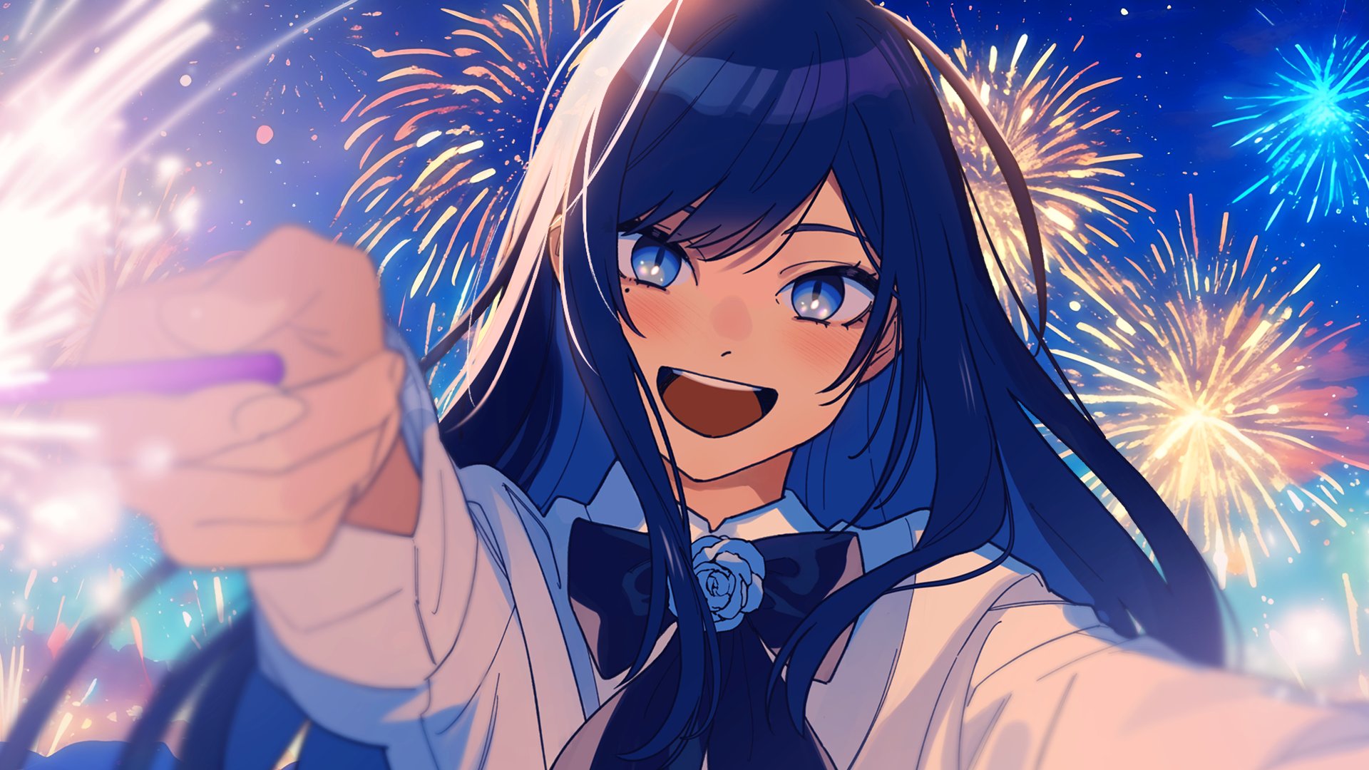 1girl ado_(utaite) aerial_fireworks black_bow black_bowtie blue_eyes blue_flower blue_hair blue_rose blush bow bowtie brooch chando_(ado) collared_shirt colored_inner_hair commentary detached_sleeves fireworks flower flower_brooch hashtag-only_commentary highres holding holding_fireworks long_hair looking_at_viewer mole mole_under_eye multicolored_hair open_mouth riseno rose shirt sidelocks solo teeth upper_body upper_teeth_only utaite white_shirt