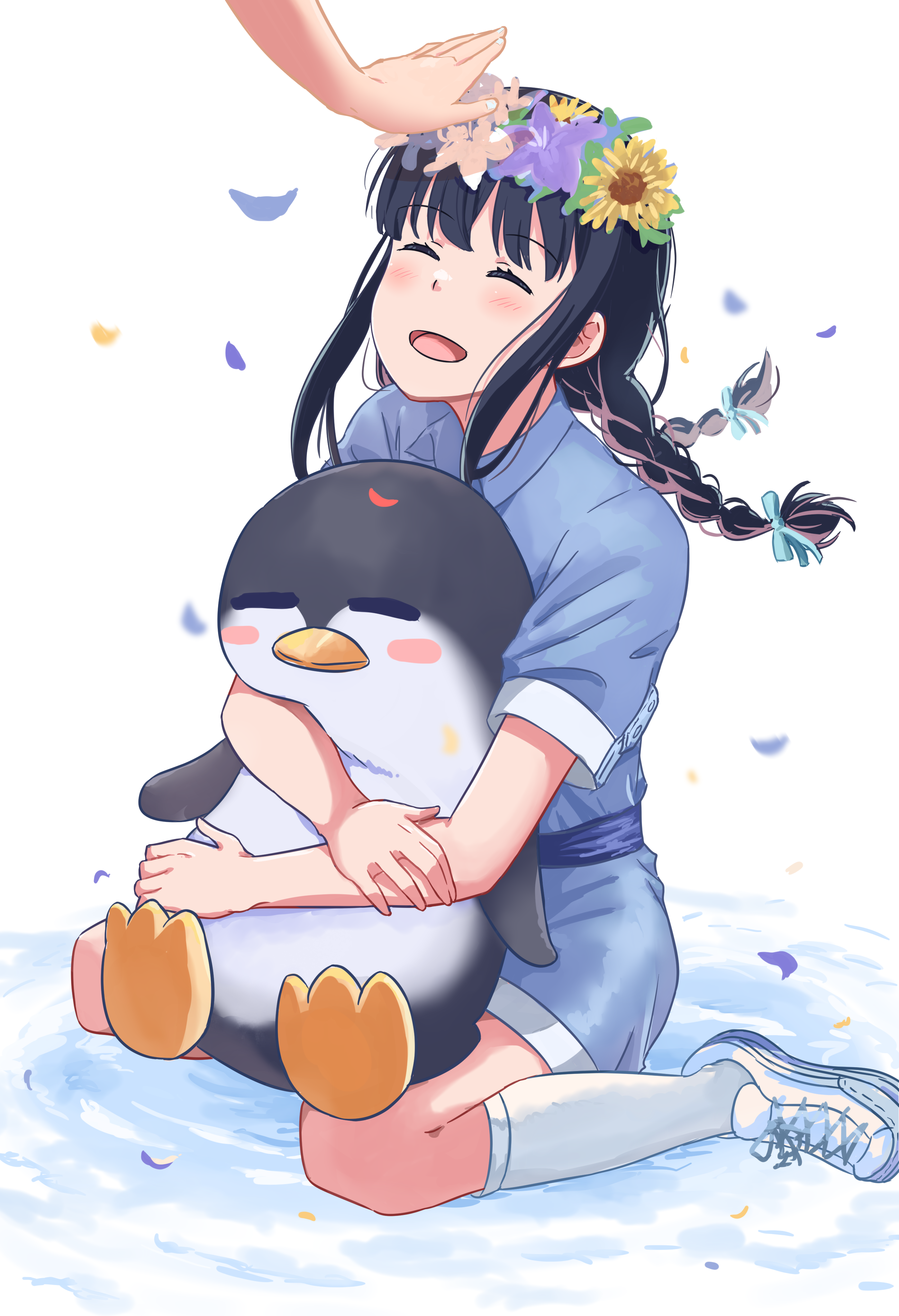 2girls ^_^ absurdres black_hair blue_dress blue_ribbon braid chai_haru closed_eyes commentary dress falling_petals flower hair_flower hair_ornament hair_ribbon headpat highres hugging_object inoue_takina kneehighs long_hair lycoris_recoil multiple_girls open_mouth petals ribbon short_sleeves sidelocks sitting socks stuffed_animal stuffed_penguin stuffed_toy sunflower twin_braids wariza white_footwear white_socks