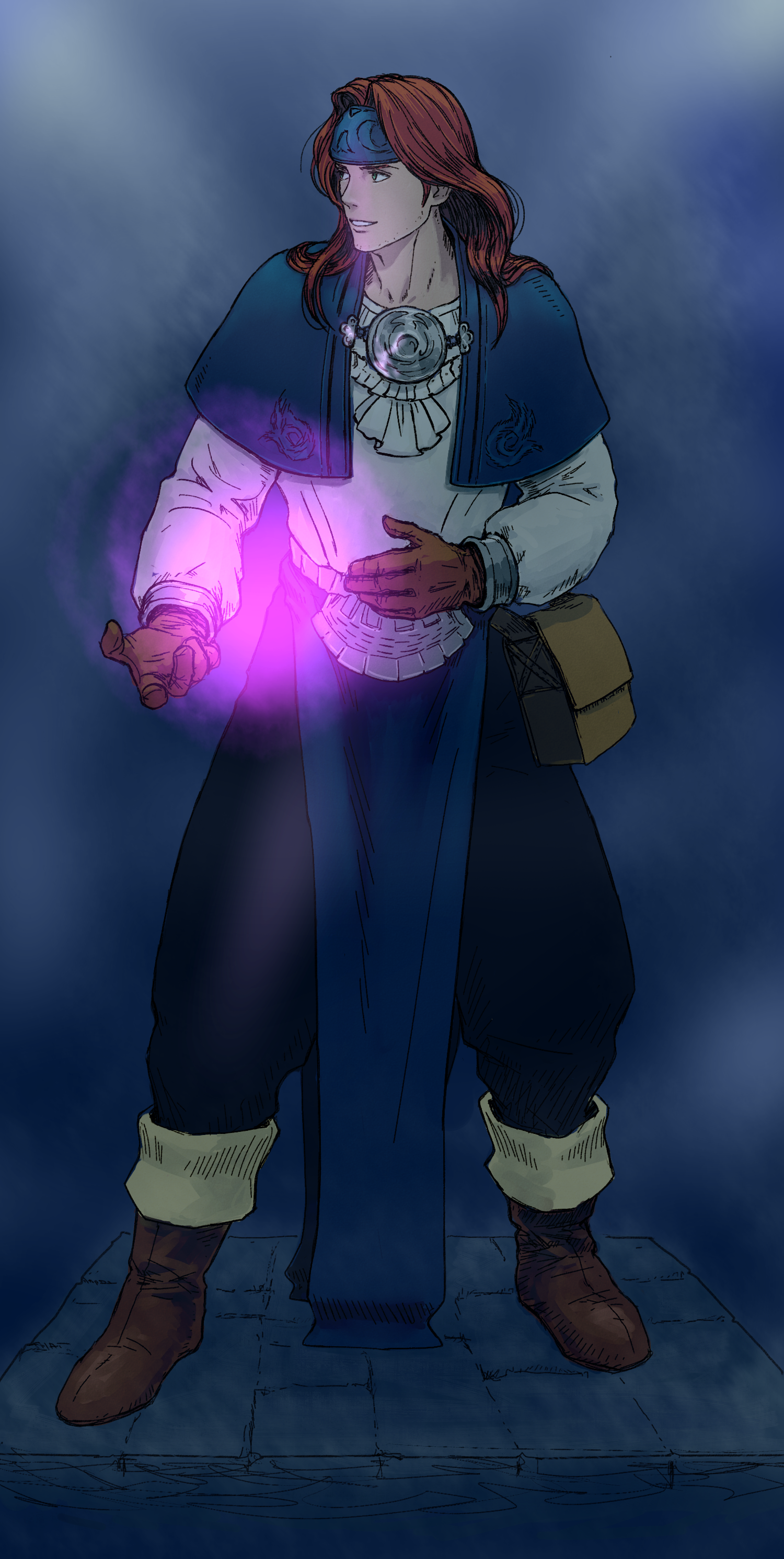 1boy absurdres bag beard_stubble blue_background blue_capelet blue_headband boots brown_footwear brown_gloves brown_hair capelet facial_hair gloves green_eyes handbag headband highres long_sleeves magic male_focus robert_rudlum shirt smile standing stubble tactics_ogre white_shirt windcaller