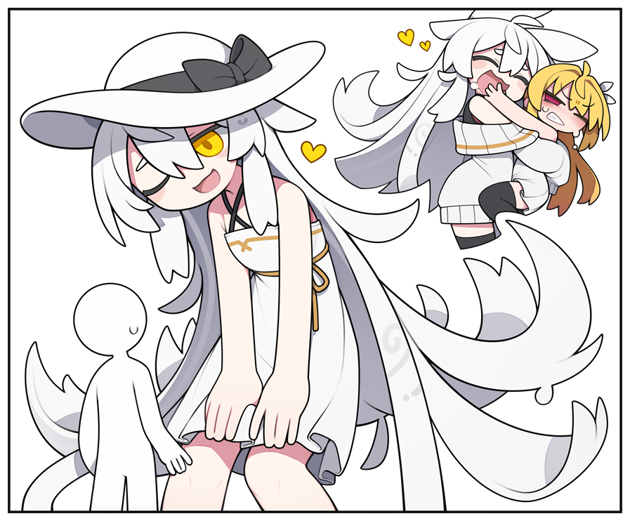 1other 2girls :3 :d ;d ahoge animal_ears bare_shoulders black_shirt black_thighhighs blonde_hair blush border bow carrying carrying_person clenched_teeth closed_eyes commentary_request cosplay cropped_legs deformed dorodra_(kisaragi_kaya) dress empire_waist from_side grey_bow grey_hair hair_bow hair_flaps hair_intakes happy hasshaku-sama hasshaku-sama_(cosplay) hat hat_bow heart hug japanese_urban_legends kisaragi_kaya leaning_forward long_hair long_sleeves looking_at_another multiple_girls multiple_views one_eye_closed open_mouth original otogi_hime_(kisaragi_kaya) pink_eyes shirt simple_background size_difference sleeveless sleeveless_dress sleeveless_shirt sleeves_past_fingers sleeves_past_wrists smile struggling sun_hat sundress sweater sweater_dress teeth thighhighs very_long_hair white_background white_border white_dress white_hat yellow_eyes zettai_ryouiki