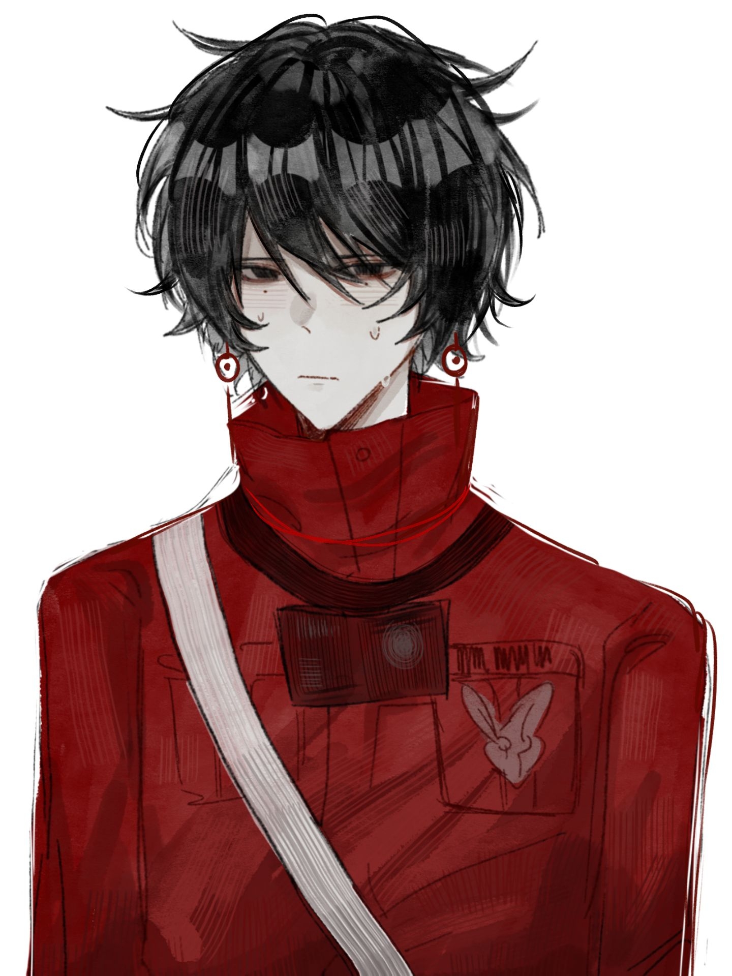 1boy baimi33 black_eyes black_hair camera camera_around_neck chinese_commentary closed_mouth commentary_request earrings high_collar highres jacket jewelry li_yuting_(male) long_sleeves looking_at_viewer male_focus mole mole_under_each_eye mole_under_eye multiple_moles red_jacket short_hair simple_background solo sweat touqi_guaitan upper_body white_background