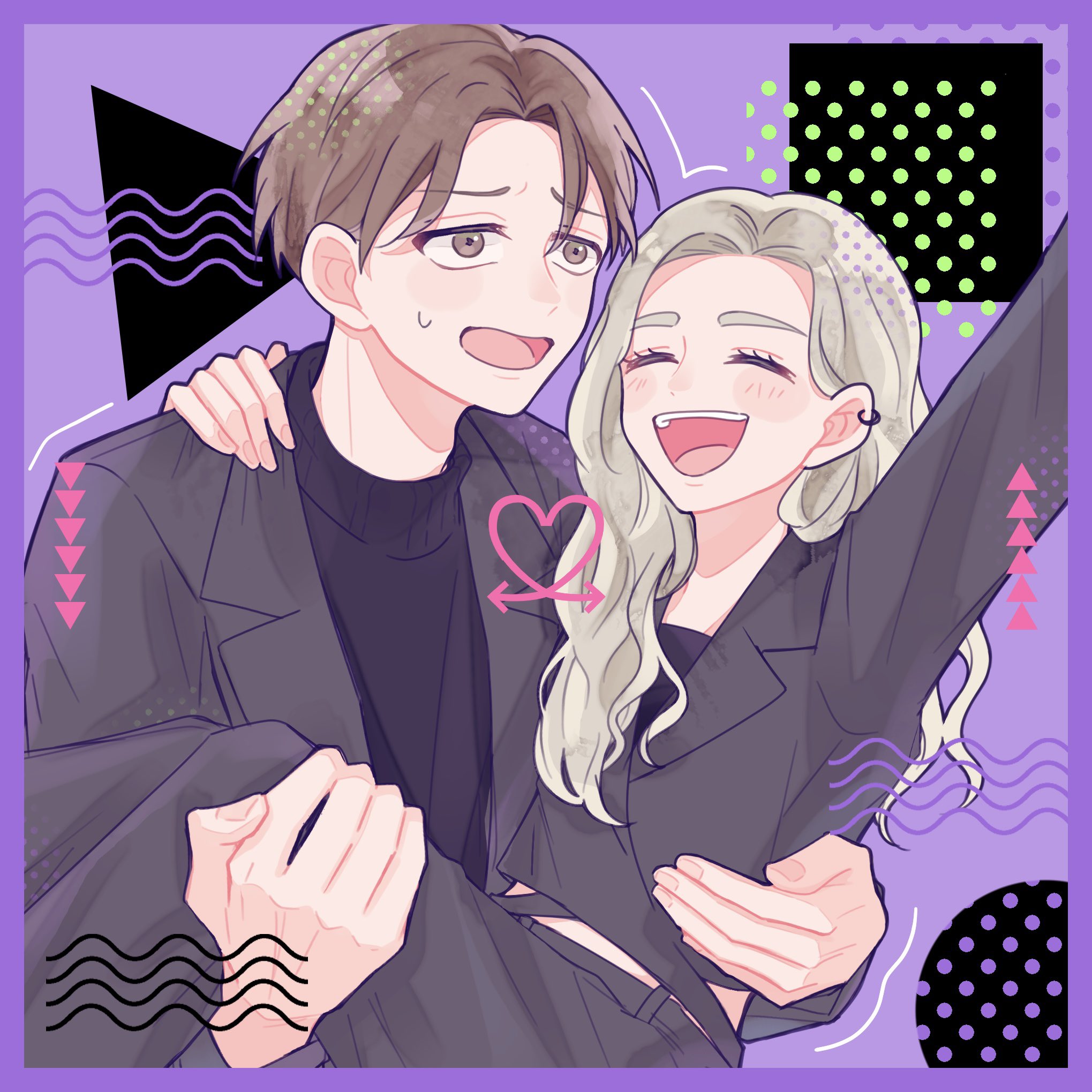 1boy 1girl azuma_(seihantai_na_kimi_to_boku) brown_eyes brown_hair forehead grey_eyes grey_hair highres jacket jo035 laughing nervous_smile seihantai_na_kimi_to_boku smile suit_jacket taira_(seihantai_na_kimi_to_boku) taira_shuuji__(seihantai_na_kimi_to_boku) turtleneck wavy_hair