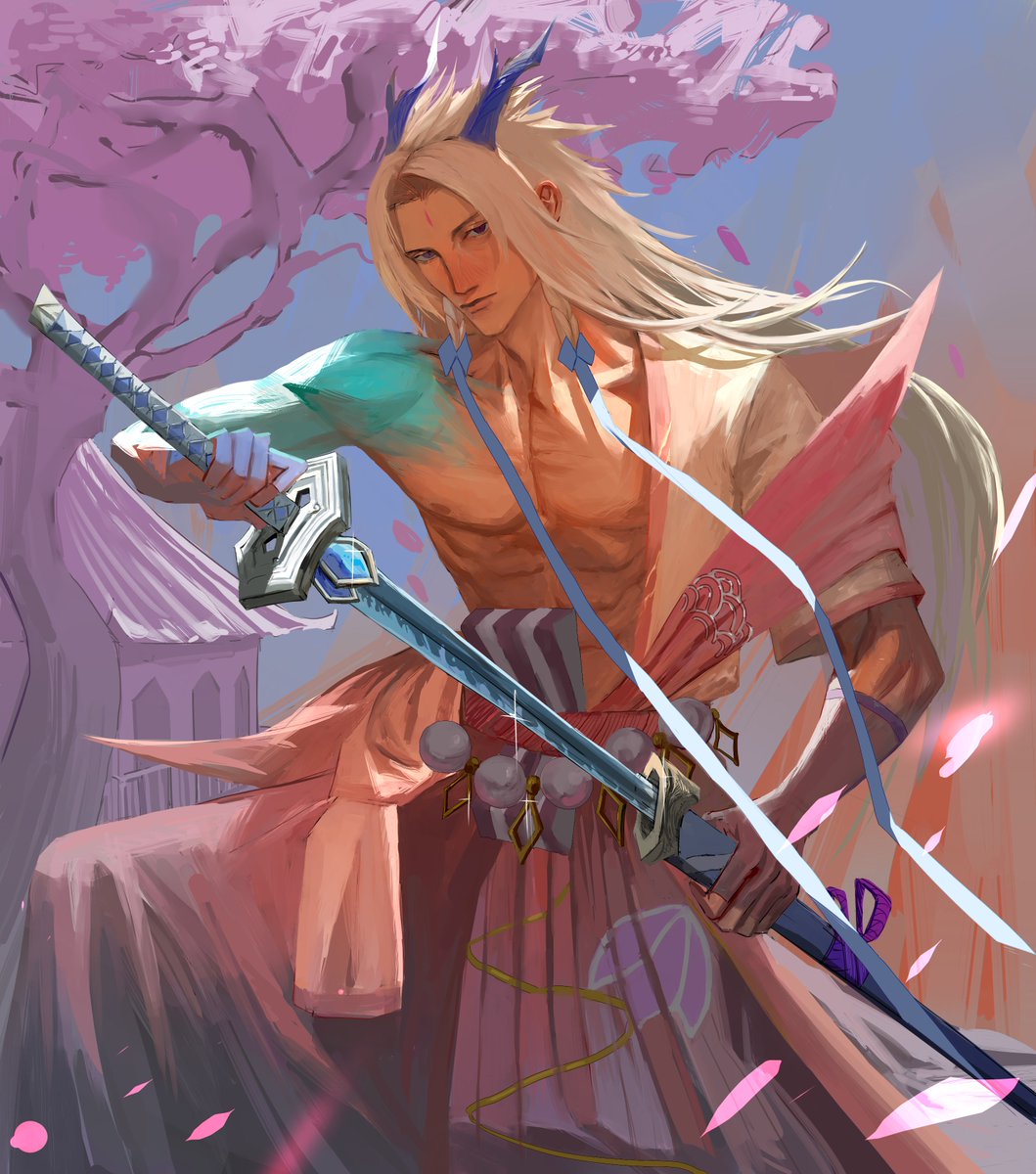 1boy abs arms_up bead_belt beads blurry blurry_background brown_eyes cherry_blossoms closed_mouth colored_skin cropped_legs falling_petals floating_hair floral_print green_skin hair_behind_ear hakama hakama_skirt highres holding holding_sword holding_weapon horns japanese_clothes katana league_of_legends long_hair looking_at_viewer male_focus muscular muscular_male nipples pectorals petals rrrr46621358 scabbard sheath shirt short_sleeves single-shoulder_shirt single_bare_shoulder skirt solo spirit_blossom_(league_of_legends) spirit_blossom_yone sword topless_male tree unsheathing weapon white_hair white_shirt yone_(league_of_legends)