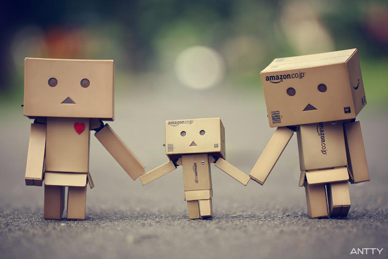 3others amazon_(company) antontang artist_name barcode blurry blurry_background blurry_foreground box cardboard_box commentary danboo depth_of_field english_commentary figure_(medium) heart holding_hands looking_at_another looking_at_viewer multiple_others photo_(medium) solid_circle_eyes triangle_mouth watermark web_address yotsubato!
