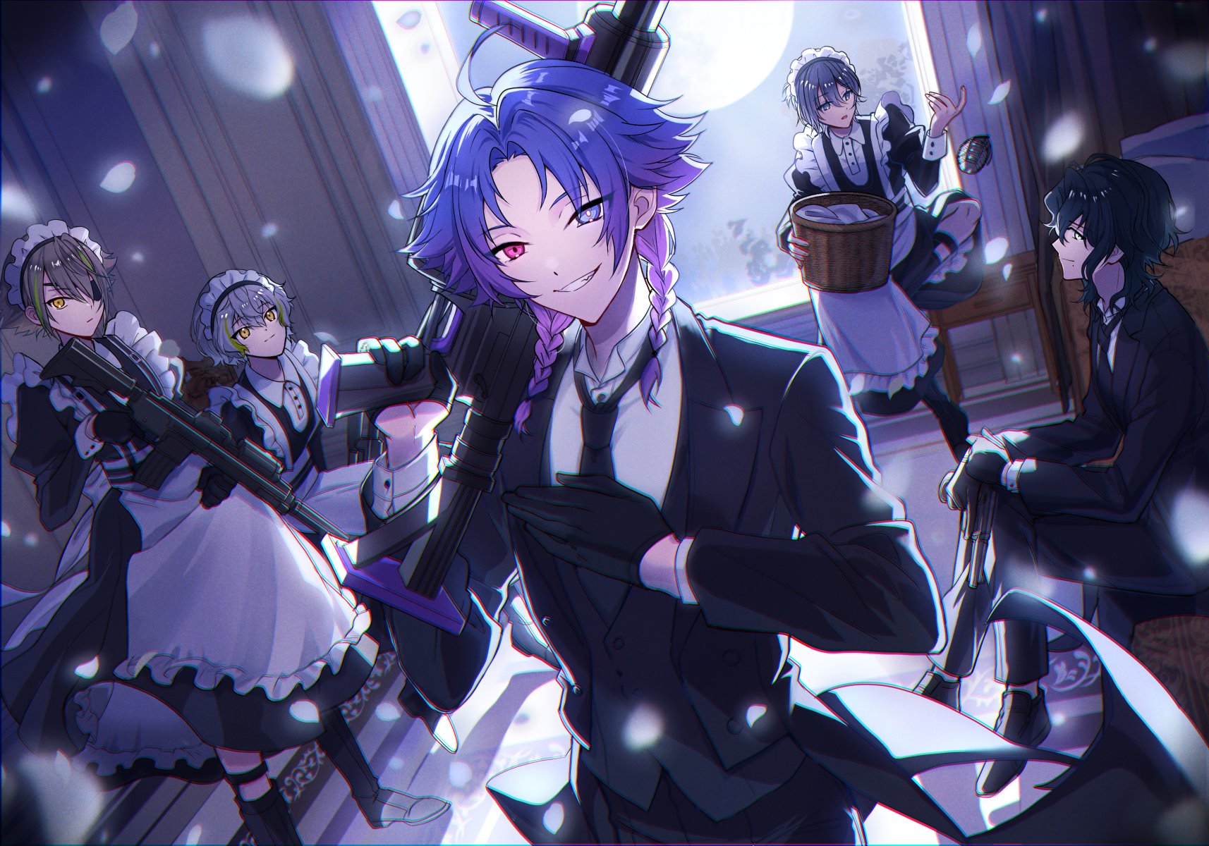 18trip 36ss_tr 5boys ahoge apron arm_up back_bow basket bed black_footwear black_gloves black_hair black_necktie black_suit bow braid branch brothers butler carpet chest_of_drawers closed_mouth coattails collared_shirt commentary cowboy_shot crossdressing crossdressing_(mtf) crossed_legs curtains desk dress dress_shirt dress_shoes explosive eyepatch falling_petals formal_clothes frilled_dress frilled_skirt frilled_sleeves frills full_body full_moon garter_straps gloves grenade grey_eyes grey_hair gun hachinoya_nagi hair_between_eyes hair_intakes hair_over_one_eye hand_on_knees hand_on_own_chest handgun headdress heterochromia highres holding holding_basket holding_gun holding_weapon holster indoors jacket juliet_sleeves knee_up lapels large_bow laundry laundry_basket layered_clothes layered_sleeves leg_holster long_sleeves looking_at_another looking_to_the_side maid maid_apron maid_headdress male_focus male_maid moon moonlight multiple_boys natsume_yodaka necktie night on_bed on_desk one_eye_covered petals pillow puffy_sleeves purple_hair shiramitsu_ryui shiramitsu_toi shirt shoes siblings sitting skirt smile suit suit_jacket tailcoat teeth twin_braids twins undershirt upper_body wavy_hair weapon white_apron white_bow white_shirt white_wrist_cuffs window wrist_cuffs yellow_eyes yowa_netaro
