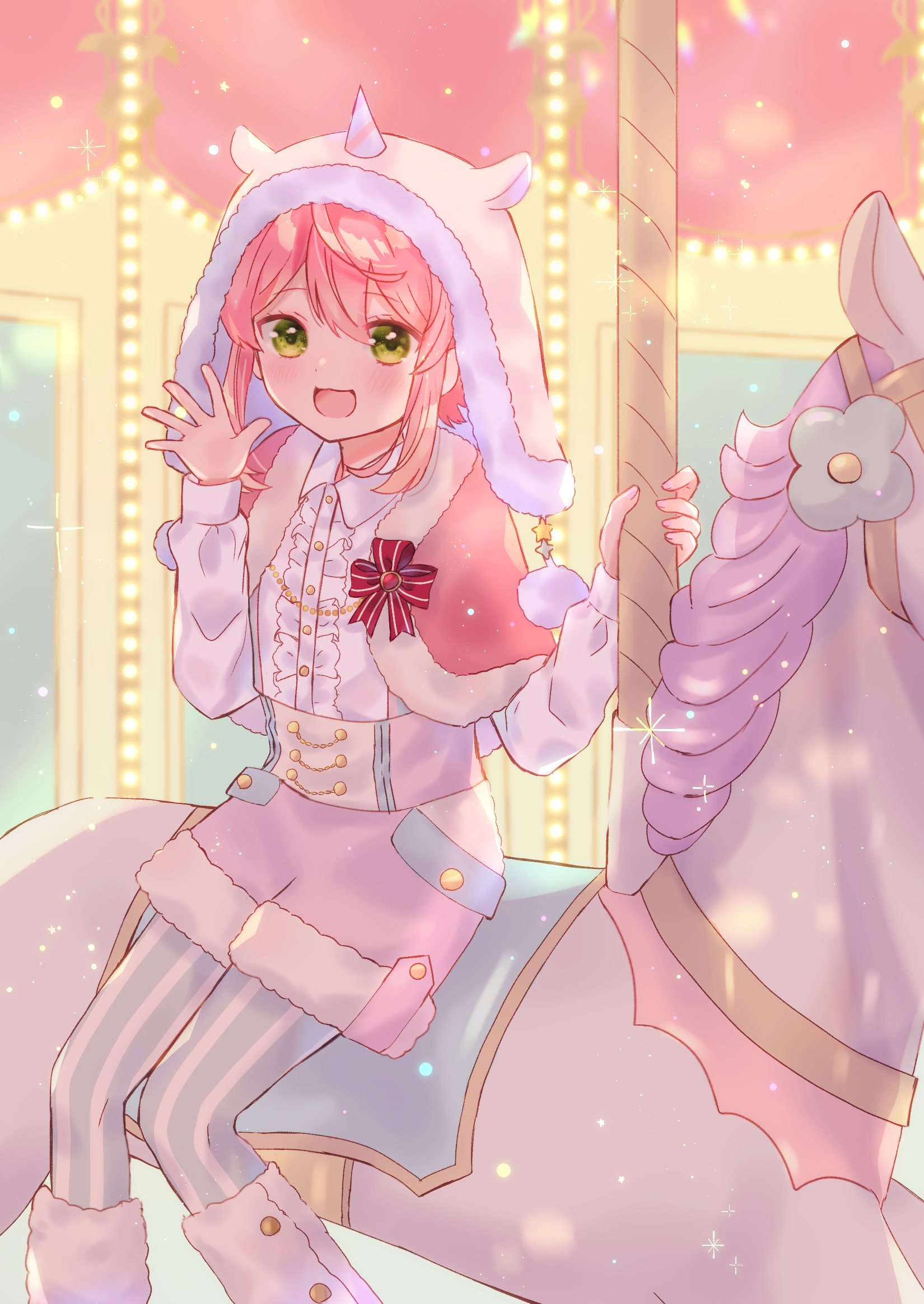 1boy :d animal_ear_headwear animal_ears azarashi6 capelet carousel collared_shirt dress_shirt ensemble_stars! fairy_kei fake_animal_ears feet_out_of_frame fur-trimmed_capelet fur_trim green_eyes hands_up highres himemiya_tori himemiya_tori_(toyland) holding holding_pole light_particles male_focus night open_mouth pastel_colors pink_capelet pole shirt shirt_tucked_in shorts sitting smile solo tongue trap waving white_shirt wing_collar yume_kawaii