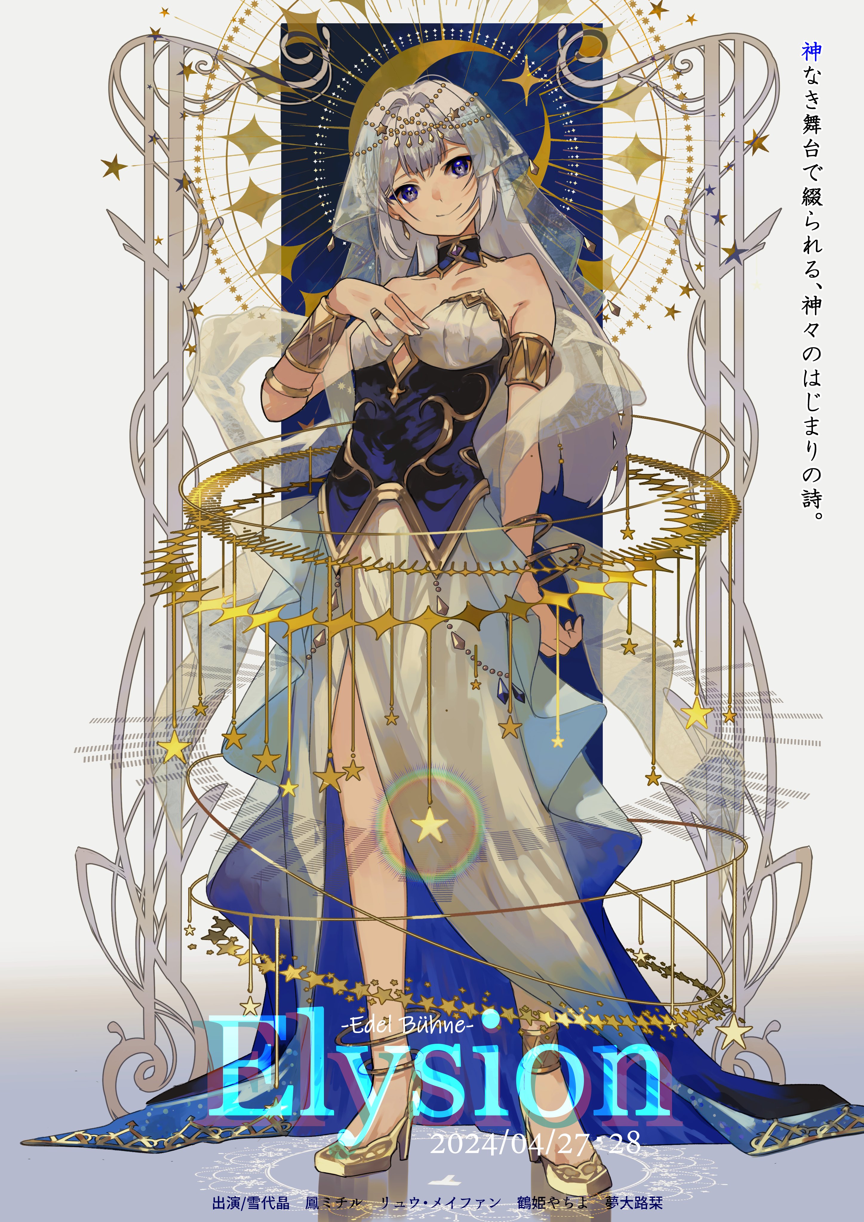 1girl absurdres armband bare_shoulders commentary_request dress earrings full_body grey_hair hair_ornament high_heels highres jewelry long_dress long_hair looking_at_viewer madori_(sayuri5) purple_eyes see-through_clothes see-through_shawl shawl shoujo_kageki_revue_starlight shoujo_kageki_revue_starlight_-re_live- sleeveless sleeveless_dress solo strapless strapless_dress translation_request vambraces veil white_dress white_veil yukishiro_akira