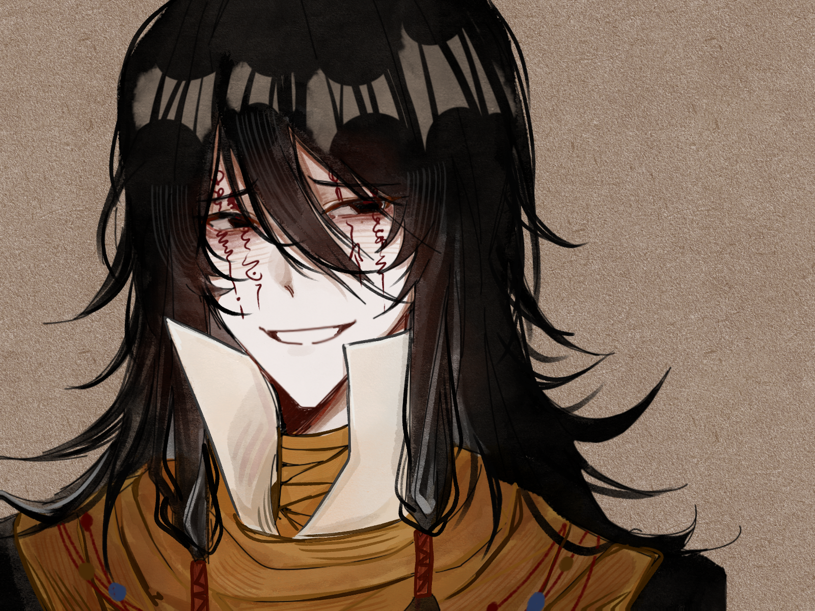 1boy baimi33 bandaged_neck bandages black_eyes black_hair black_jacket brown_background chinese_commentary commentary_request facial_tattoo hair_between_eyes highres jacket long_bangs long_hair male_focus pale_skin portrait scarf shirt simple_background smile solo tattoo touqi_guaitan white_shirt yellow_scarf ziche_fuzhao
