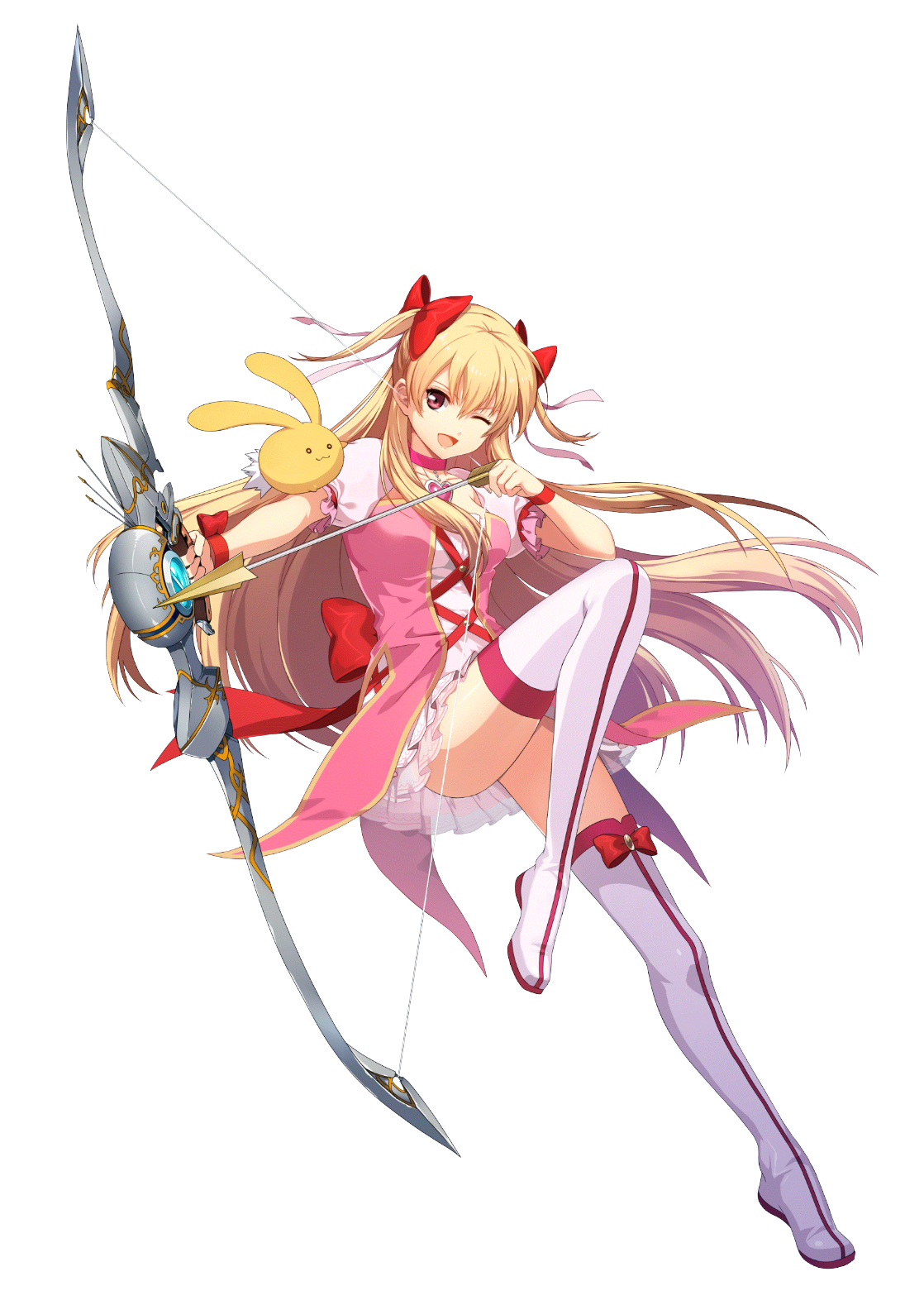1girl ;d akatsuki_no_kiseki alisa_reinford blonde_hair boots bow bow_(weapon) dress eiyuu_densetsu floating_hair full_body hair_bow highres holding holding_bow_(weapon) holding_weapon leg_up long_hair magical_girl multicolored_dress official_alternate_costume official_art one_eye_closed open_mouth pink_dress pleated_dress red_bow red_eyes sen_no_kiseki_(series) sen_no_kiseki_i short_dress short_sleeves smile solo thigh_boots transparent_background twintails very_long_hair weapon white_boots white_dress