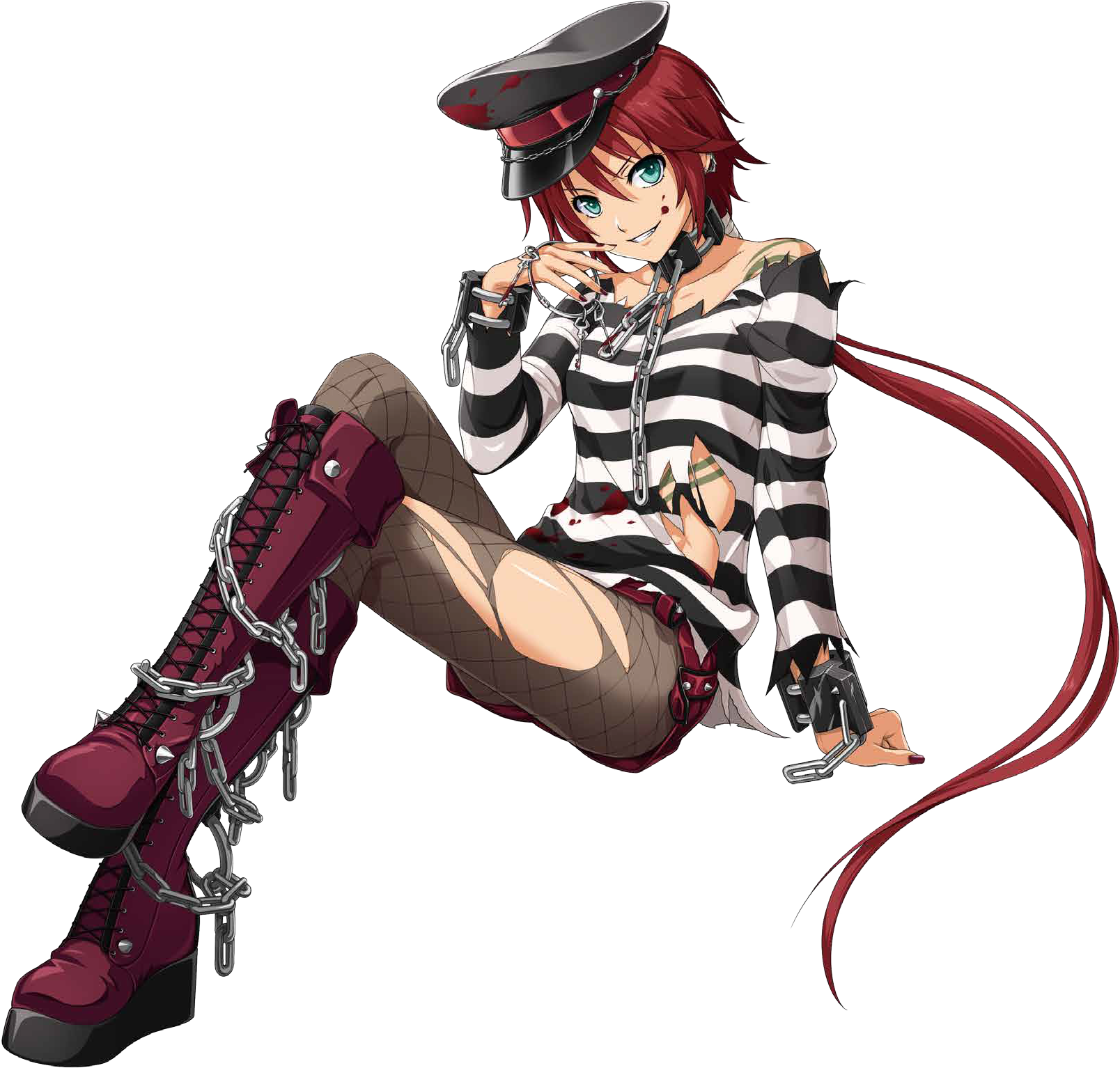 1girl akatsuki_no_kiseki ao_no_kiseki aqua_eyes blood blood_on_face boots chain collarbone crossed_legs eiyuu_densetsu fishnet_pantyhose fishnets floating_hair full_body grey_pantyhose grin hair_between_eyes hat highres invisible_chair knee_boots lace-up_boots long_hair long_sleeves looking_at_viewer low_ponytail nail_polish official_art pantyhose peaked_cap ponytail red_boots red_hair red_nails shirley_orlando shirt sitting smile solo striped_clothes striped_shirt torn_clothes torn_pantyhose torn_shirt transparent_background very_long_hair