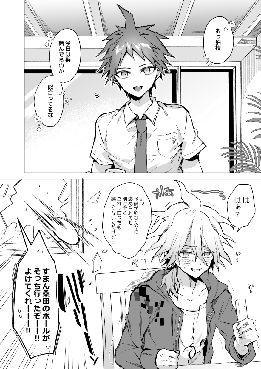 2boys ahoge ball breast_pocket broken_window chair collarbone collared_shirt danganronpa_(series) danganronpa_2:_goodbye_despair greyscale highres hinata_hajime holding jacket komaeda_nagito long_sleeves male_focus monochrome multiple_boys necktie open_clothes open_jacket pocket print_shirt shirt short_hair smile yumeyume_2z