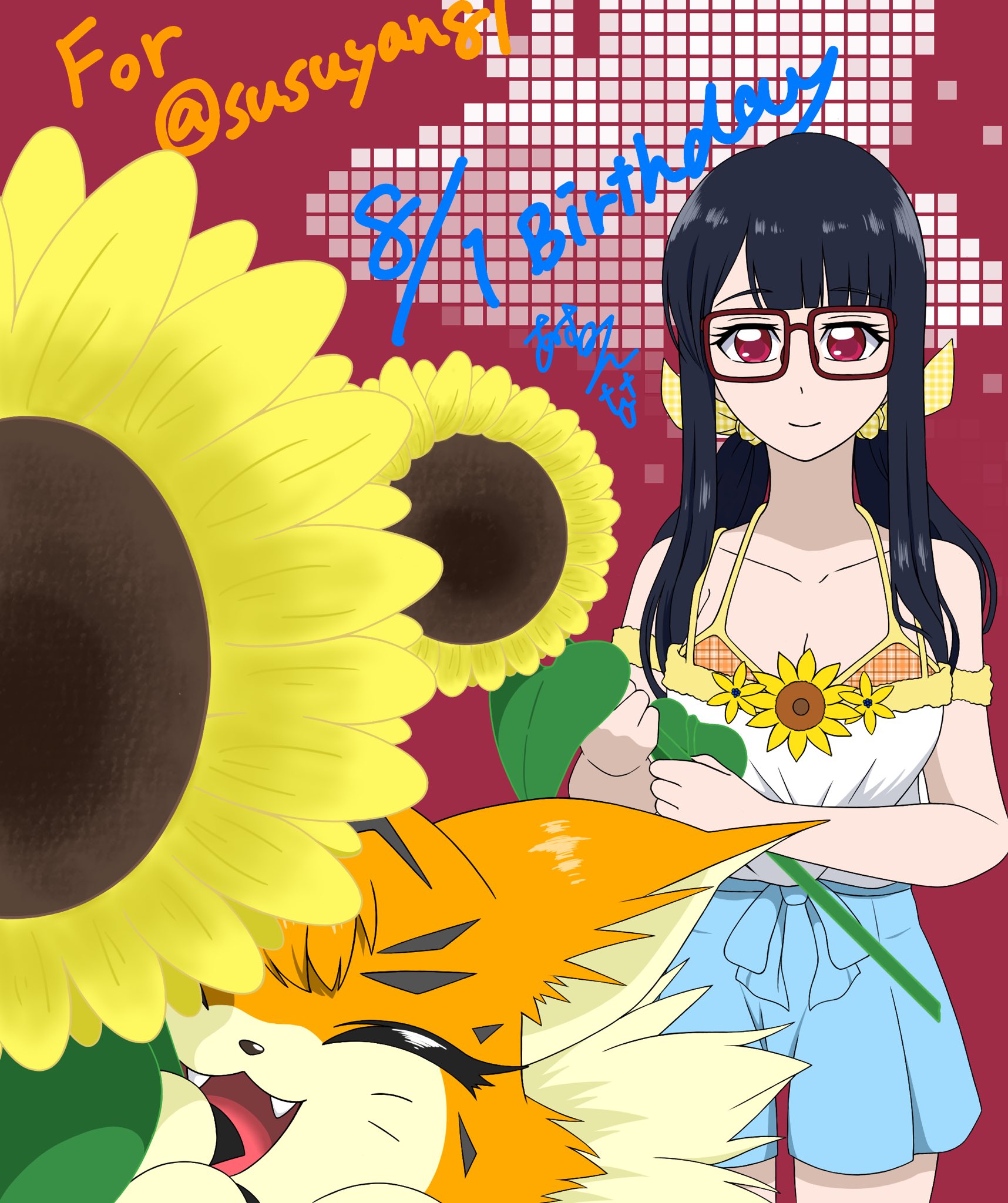 1girl black_hair digimon digimon_(creature) digimon_adventure_tri. fang flower highres looking_at_viewer meicoomon mochizuki_meiko red_eyes smile sunflower