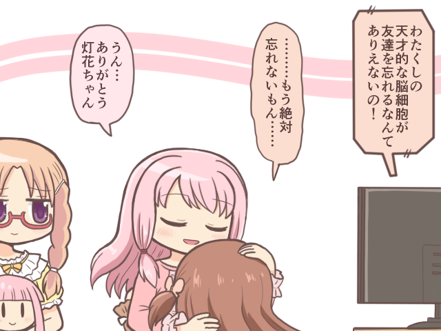 3girls bad_id bad_twitter_id braid brown_hair character_doll closed_eyes doll glasses hand_on_another's_head hiiragi_nemu hiiragi_nemu_(hospital_costume) holding holding_doll hug long_hair long_sleeves looking_at_another magia_record:_mahou_shoujo_madoka_magica_gaiden mahou_shoujo_madoka_magica multiple_girls one_side_up open_mouth pink_hair purple_eyes reverse_(bluefencer) satomi_touka satomi_touka_(hospital_costume) sidelocks smile speech_bubble tamaki_iroha tamaki_ui tamaki_ui_(hospital_costume) television twin_braids