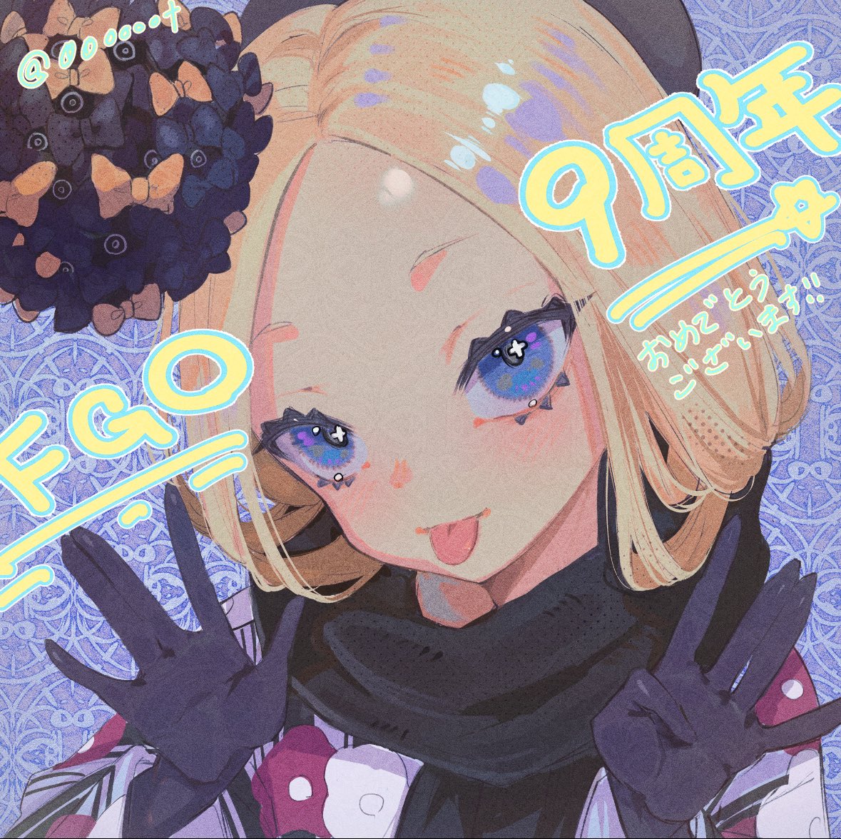 1girl abigail_williams_(exhibition_attire)_(fate) abigail_williams_(fate) black_bow black_gloves black_kimono black_scarf blonde_hair blue_eyes blush bow breasts fate/grand_order fate_(series) floral_print forehead gloves hair_bow japanese_clothes kimono layered_clothes layered_kimono long_sleeves looking_at_viewer medium_hair orange_bow ota_(ota-0000) parted_bangs scarf small_breasts smile solo tongue tongue_out wide_sleeves