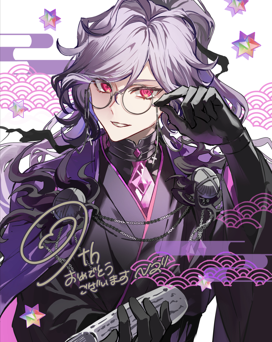 1boy adjusting_eyewear aiguillette black_choker black_gloves choker cross-shaped_pupils edmond_dantes_(fate) fate/grand_order fate_(series) glasses gloves grey_hair haori high_ponytail highres holding japanese_clothes long_hair looking_at_viewer male_focus official_alternate_costume ponytail poppoman red_eyes round_eyewear saint_quartz_(fate) smile solo symbol-shaped_pupils the_count_of_monte_cristo_(fate) the_count_of_monte_cristo_(exhibition_attire)_(fate) translation_request upper_body