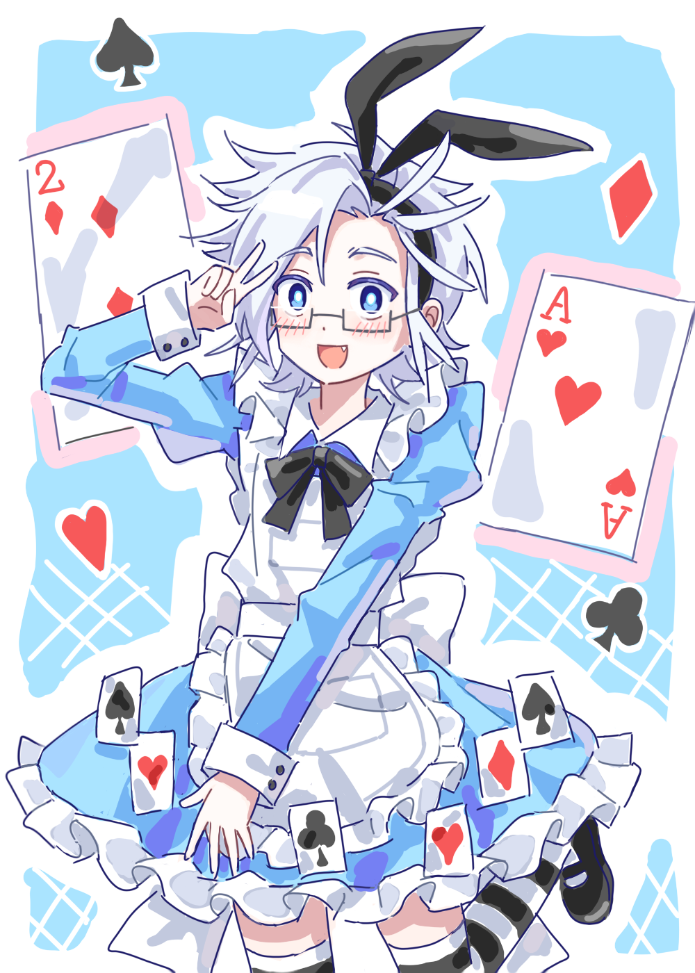 1boy alice's_adventures_in_wonderland alice_(alice_in_wonderland) alice_(alice_in_wonderland)_(cosplay) apron black_hairband black_ribbon black_shoes blue_dress blue_eyes blush bright_pupils card chinese_commentary collared_shirt commentary_request cosplay crossdressing crossdressing_(mtf) dress fang frilled_apron frilled_dress frills glasses hairband highres juliet_sleeves kanou_aogu leg_up long_sleeves maid_apron male_focus mary_janes mei4922237 neck_ribbon open_mouth playing_card puffy_sleeves rectangular_eyewear ribbon saibou_shinkyoku semi-rimless_eyewear shirt shoes short_hair smile solo striped_clothes striped_thighhighs thighhighs trap v white_apron white_hair white_pupils white_thighhighs