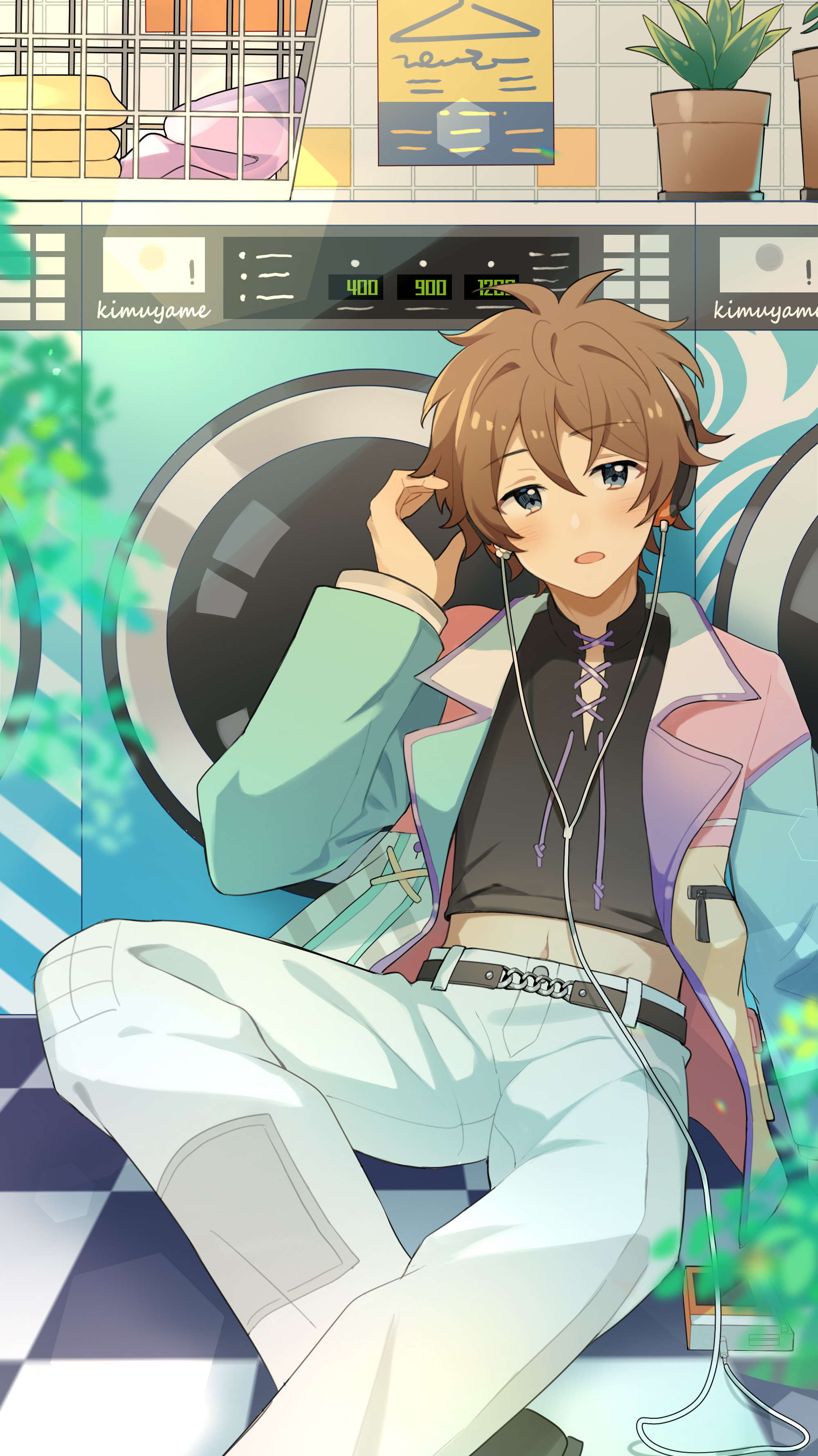 1boy absurdres belt bishounen black_belt black_footwear black_shirt blurry checkered_floor crop_top depth_of_field double-parted_bangs earphones ensemble_stars! feet_out_of_frame fenghu_(huli) foliage groin hand_on_floor hand_up high-waist_pants highres indian_style indoors jacket laundromat laundry_basket light_brown_hair looking_at_viewer male_focus midriff multicolored_jacket navel on_floor open_clothes open_jacket outstretched_leg pants parted_lips plant potted_plant reclining shirt short_hair sidelighting sitting solo sunlight takamine_midori v-neck washing_machine white_pants
