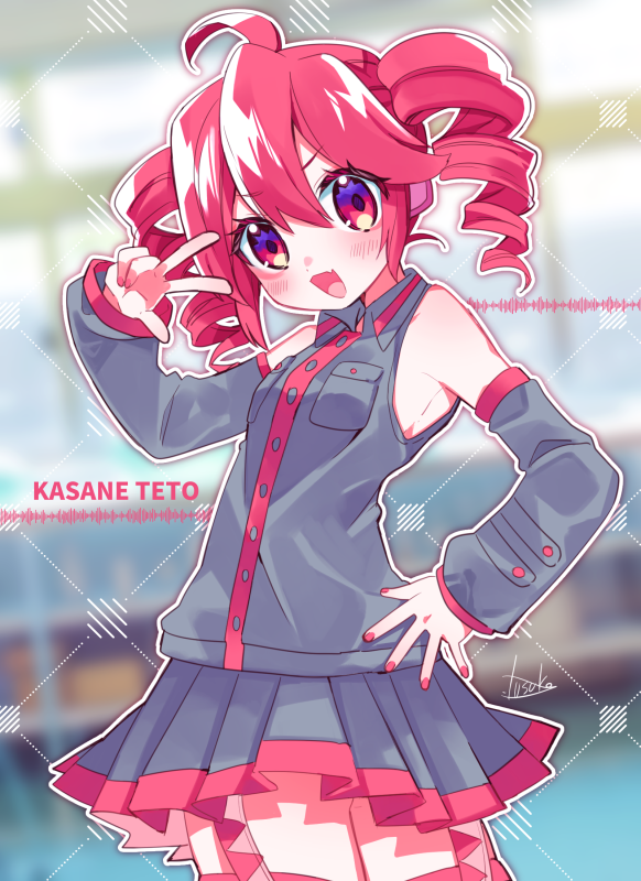 1girl ahoge black_shirt black_skirt black_sleeves blurry blurry_background blush buttons character_name detached_sleeves dot_nose drill_hair fang hair_between_eyes kasane_teto kasane_teto_(utau) looking_at_viewer open_mouth pink_eyes pink_hair red_trim shirt sidelocks signature skin_fang skirt sleeveless sleeveless_shirt smile solo sound_wave twin_drills utau v yuusuke-kun