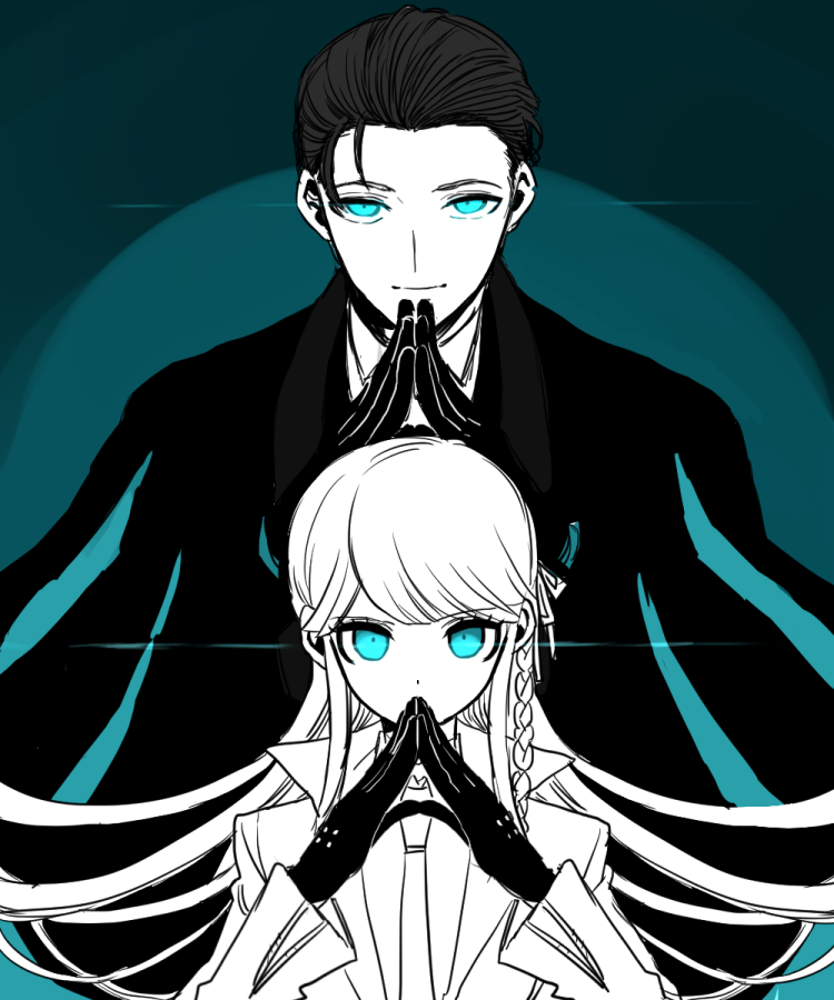 1boy 1girl black_gloves black_hair black_jacket blue_background blue_eyes braid danganronpa:_trigger_happy_havoc danganronpa_(series) dress_shirt fate/grand_order fate_(series) gloves hair_ribbon hand_to_own_mouth jacket kirigiri_kyoko monochrome necktie open_clothes open_jacket own_hands_together partially_colored ribbon sherlock_holmes_(fate) shirt single_braid smile takashi_(onikukku) white_hair white_jacket white_shirt